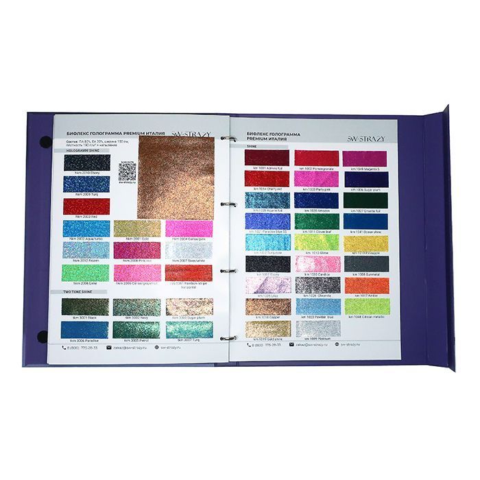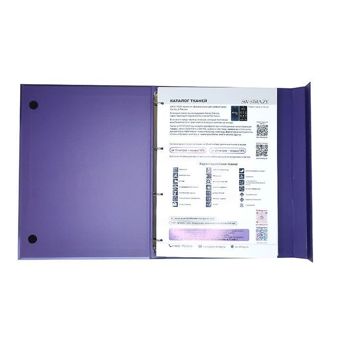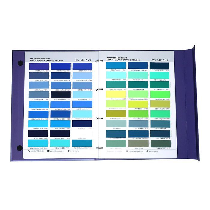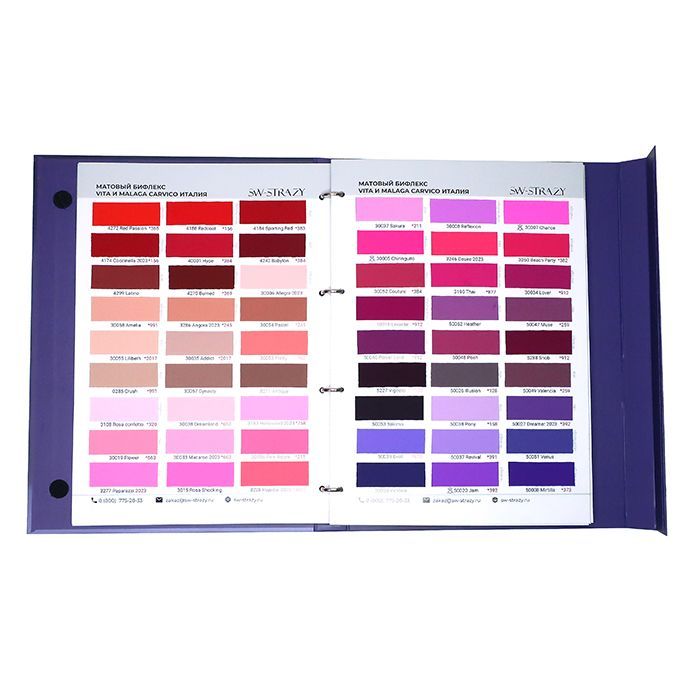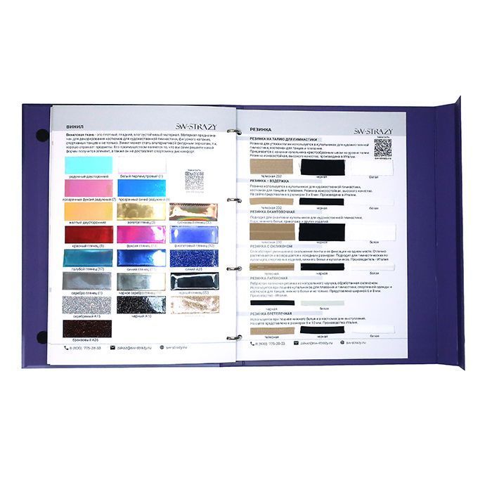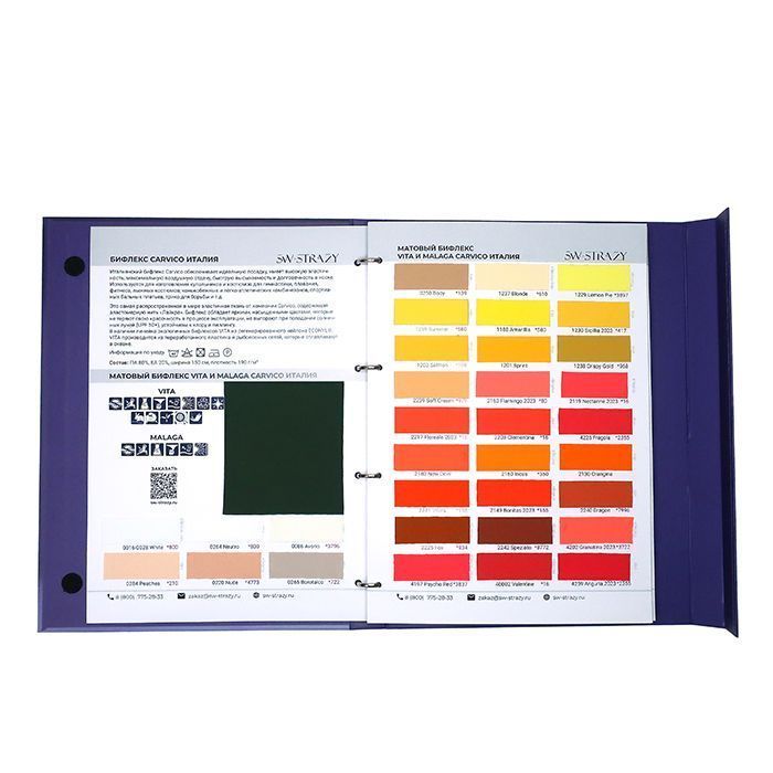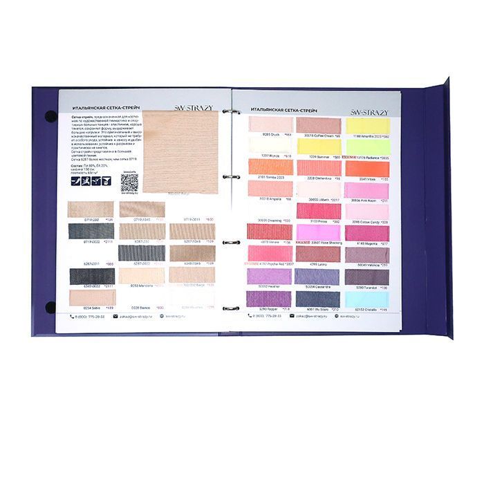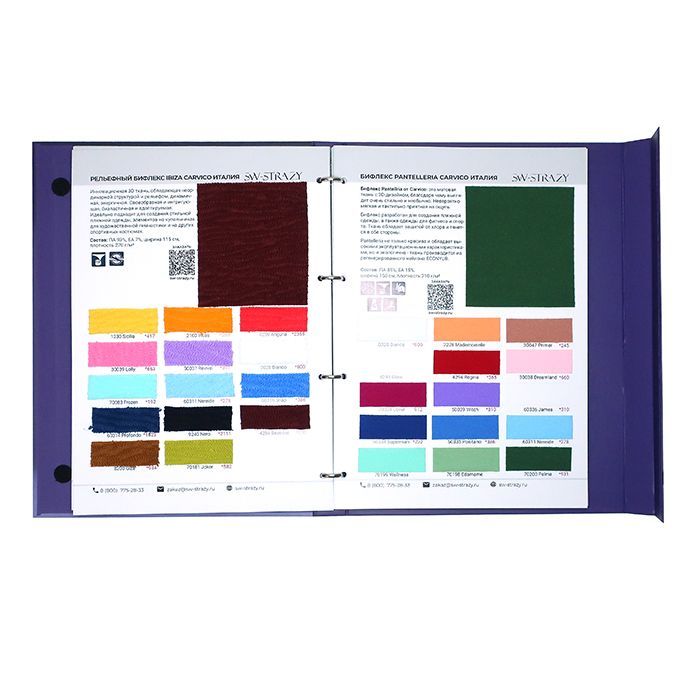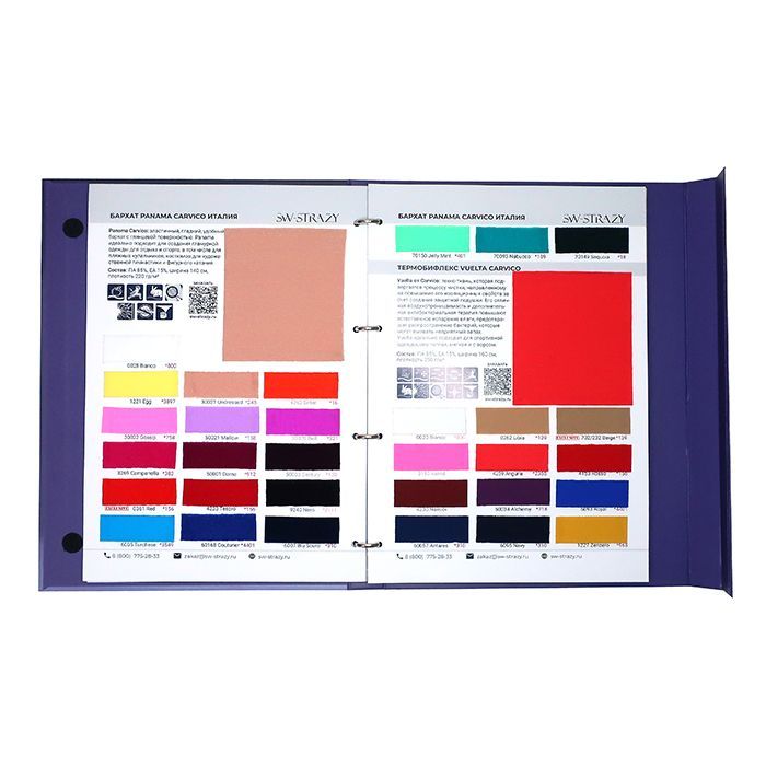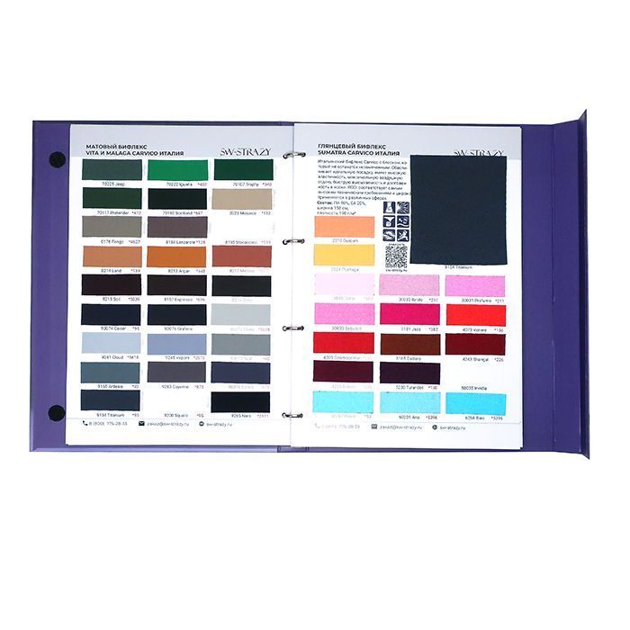 В каталоге тканей представлено 26 страниц с более 350 образцами тканей, среди которых сетка-стрейч, бархат, голограмма, термобифлекс, микрофибра, винил, около 100 цветов итальянского бифлекса Carvico фабричного качества, а также образцы резинки.