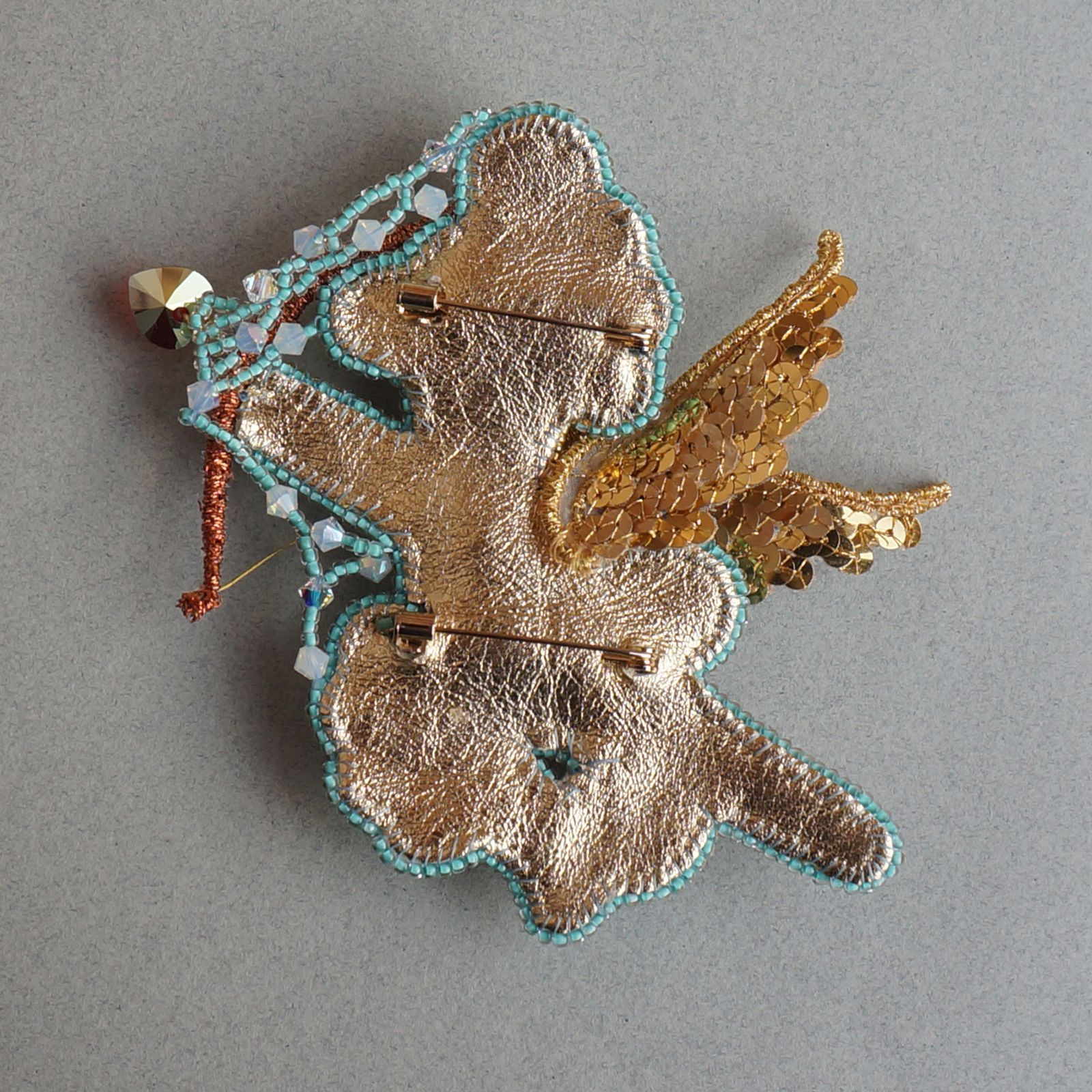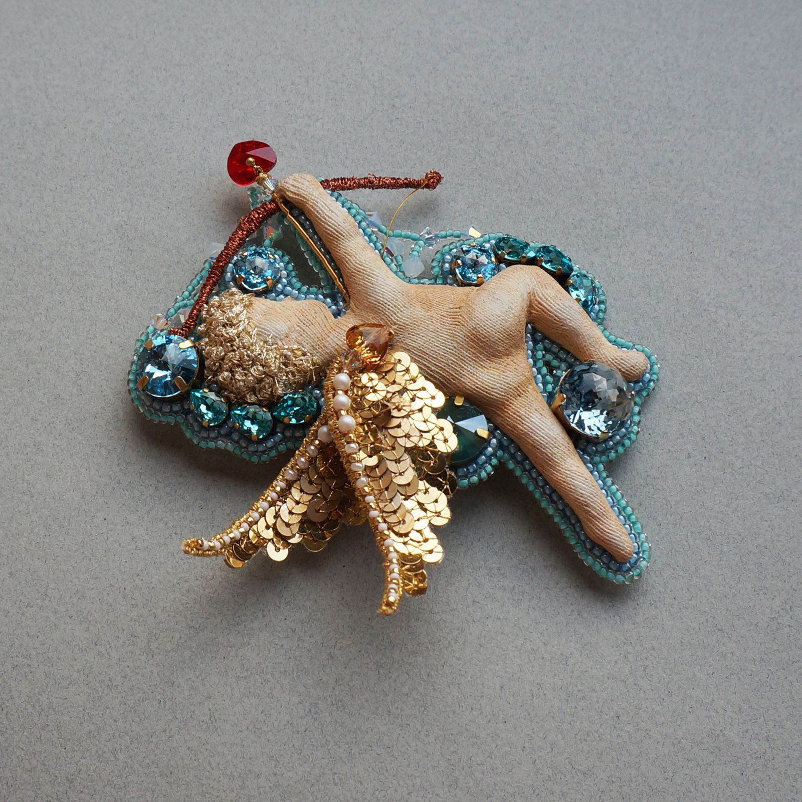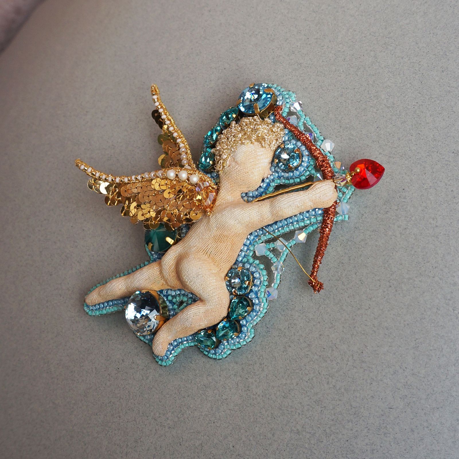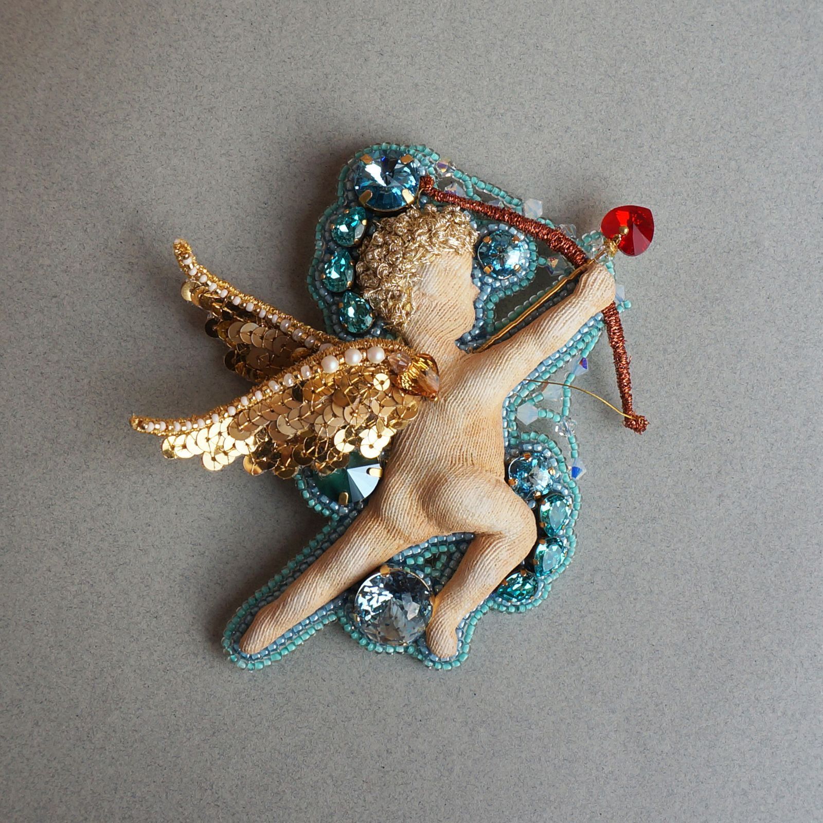 Брошь "Купидон, выпускающий стрелу любви к кристаллам в сердце рукодельницы"