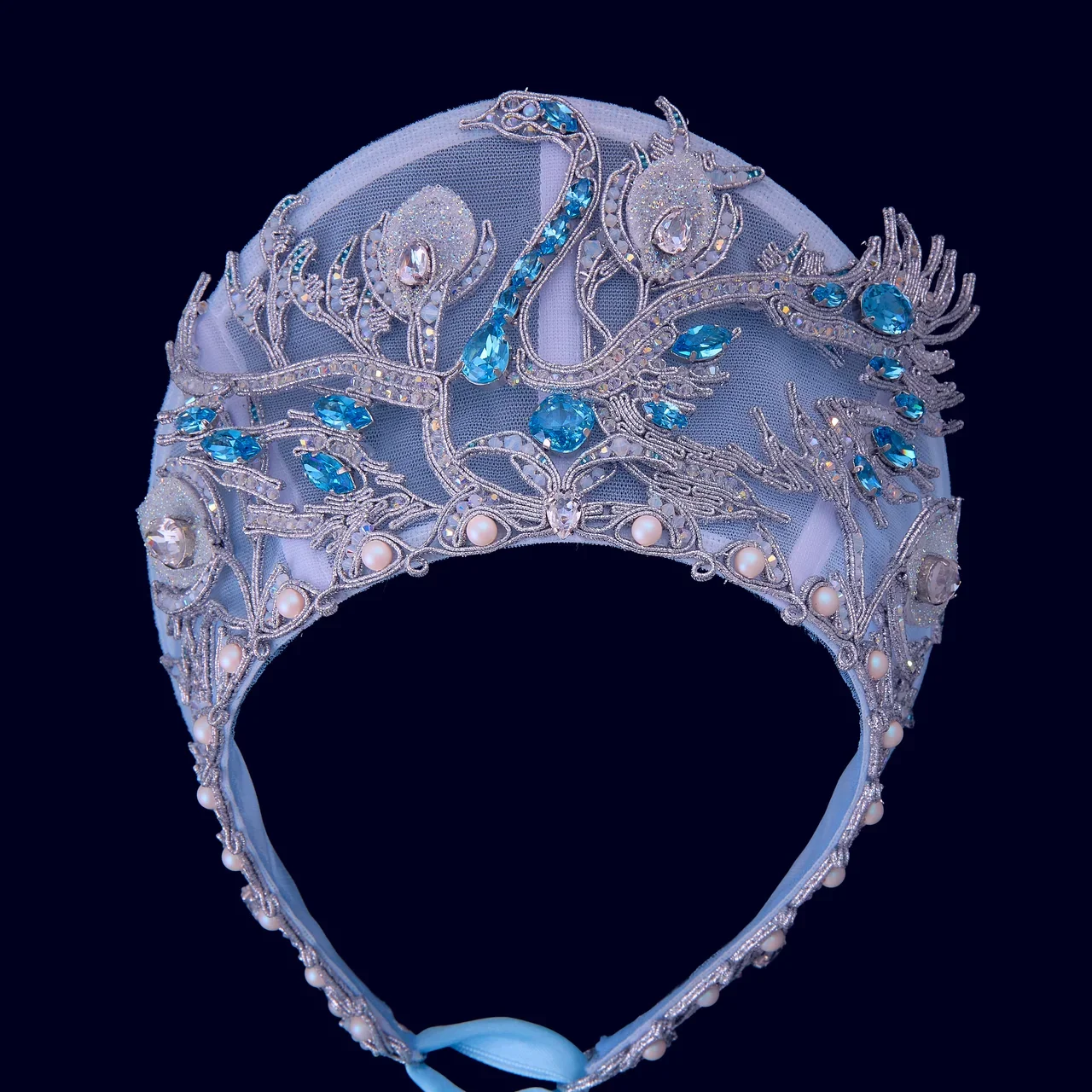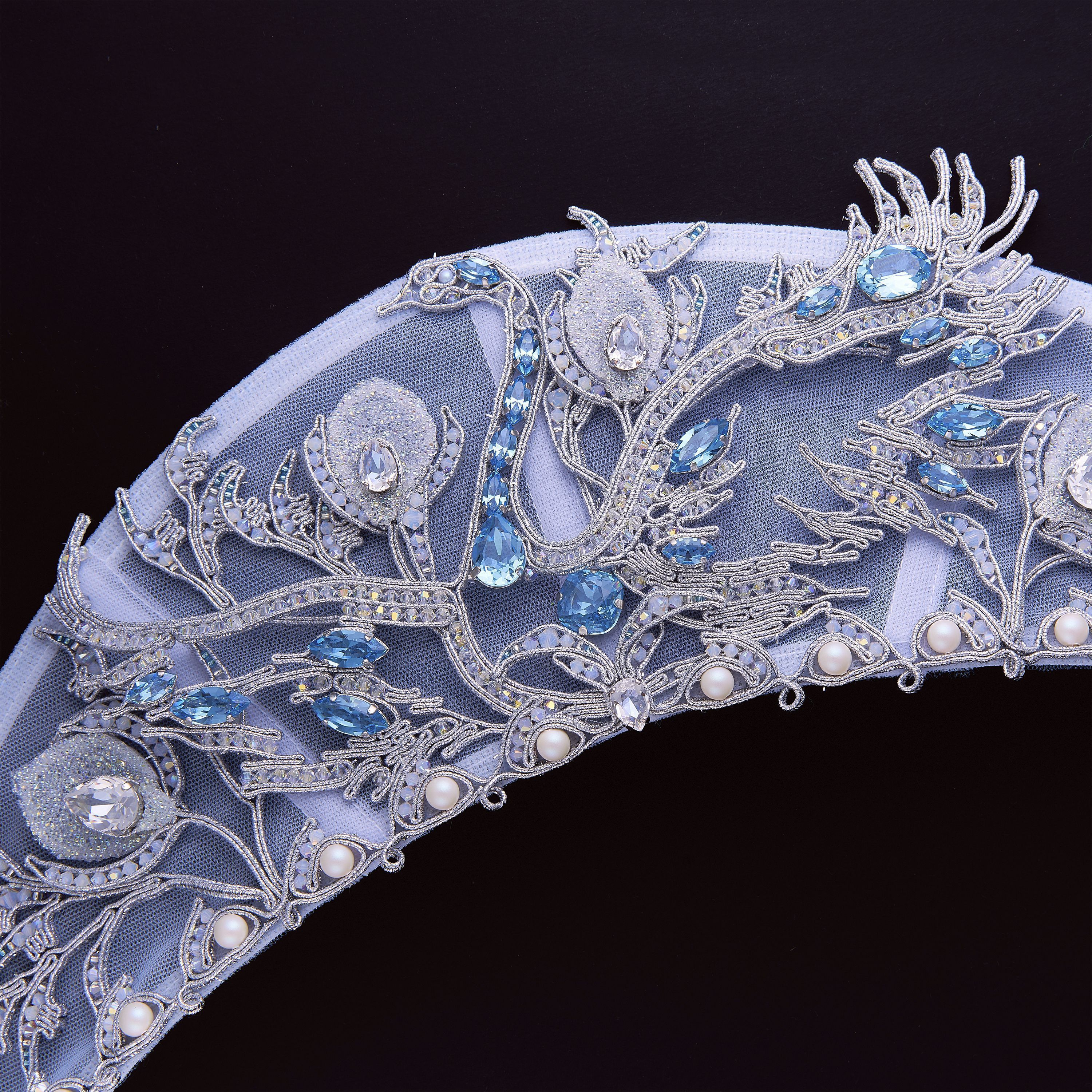 Со времен глубокой древности лебедь служит символом красоты, любви и верности. Недаром эта прекрасная птица является логотипом компании Сваровски, остающейся семейной по сей день. Каждое поколение наследников не только сохраняет традиции, но и открывает новые. Благодаря красоте и доступности кристаллов Сваровски можно было создать настоящие шедевры, за что мы им безмерно благодарны.  К сожалению, компания покидает сегмент рукоделия и спорта, и в честь последнего конкурса при поддержке Сваровски, я решила сделать лебедя, поместив его на исконно русский головной убор – кокошник. Но изготовлен он не в традиционной технике «сажение жемчуга по бели», где плетеный шнур пришивается на ткань и украшается жемчугом, а с использованием современной техники работы с сутажом. Это позволило сделать кокошник более изящным, легким и надежным. На работу ушло более 70 часов. Вся вышивка, от начала до конца, сделана единым рисунком из двух цельных металлизированных сутажных шнуров шириной 2,5 мм, между которыми вшиты бусины, кристаллы и жемчужины. А затем уже закреплена на кокошнике, выполненном в технике изготовления прозрачных корсетов. Благодаря этому, грациозный лебедь как будто создан из воздуха и блеска.