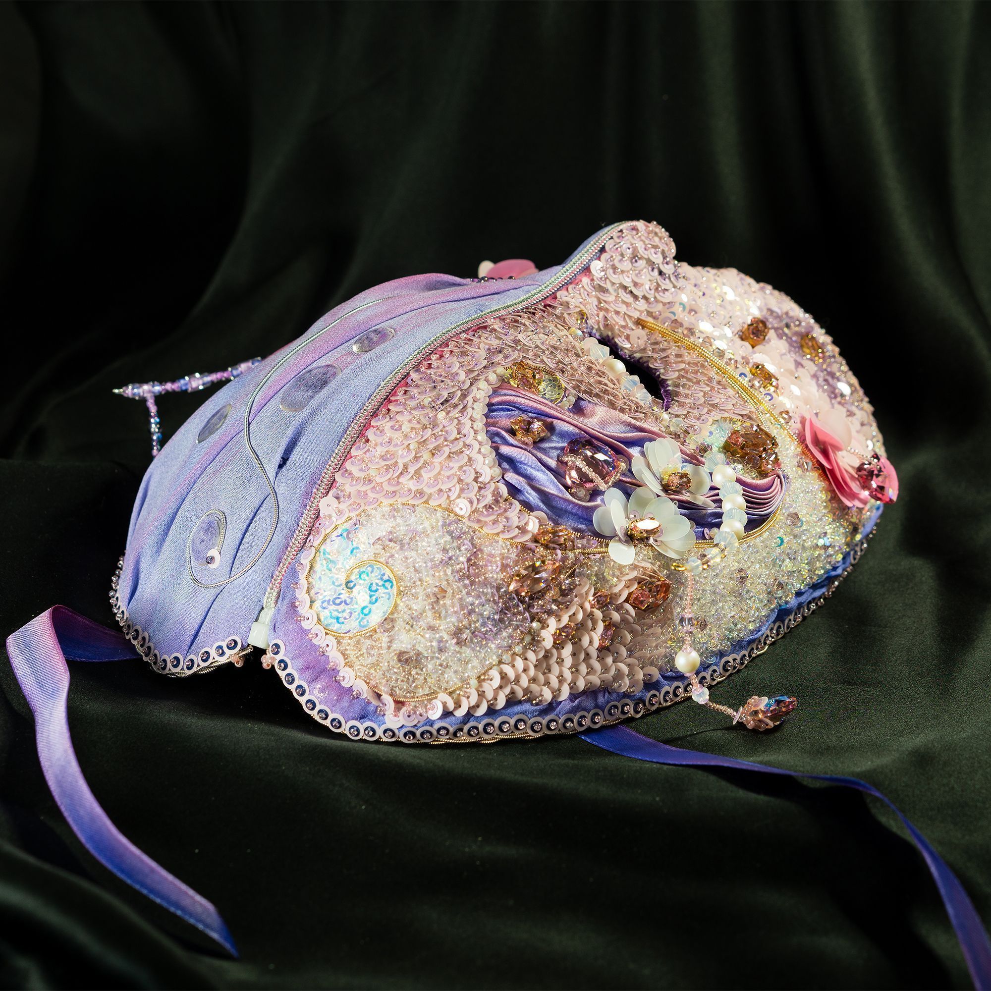Двуликая маска "Пробуждение" - это метафора ухода эпохи. Цветущая, нежная сторона сна с кристаллами основного цвета Light Rose Shimmer и Light Rose Ignite соответствует времени, когда мастера с нежной любовью создавали бесконечное множество творений из кристаллов Сваровски: здесь буйство граней, подчеркнутое пайетками и биконусами, распускающийся бутон с кристальным сердечком, ресничка из жемчуга и биконусов, скопления кристаллов и сплошное сияние.