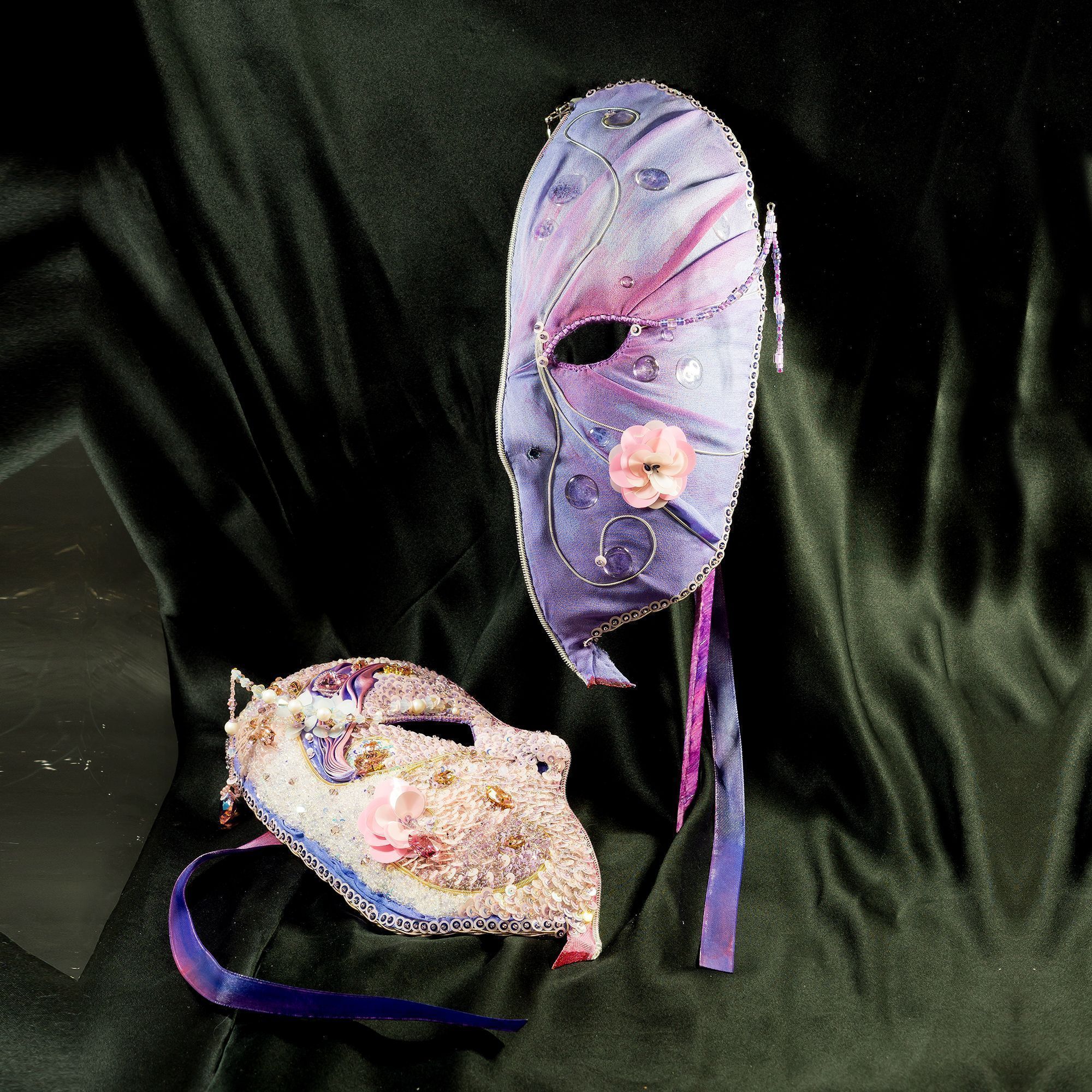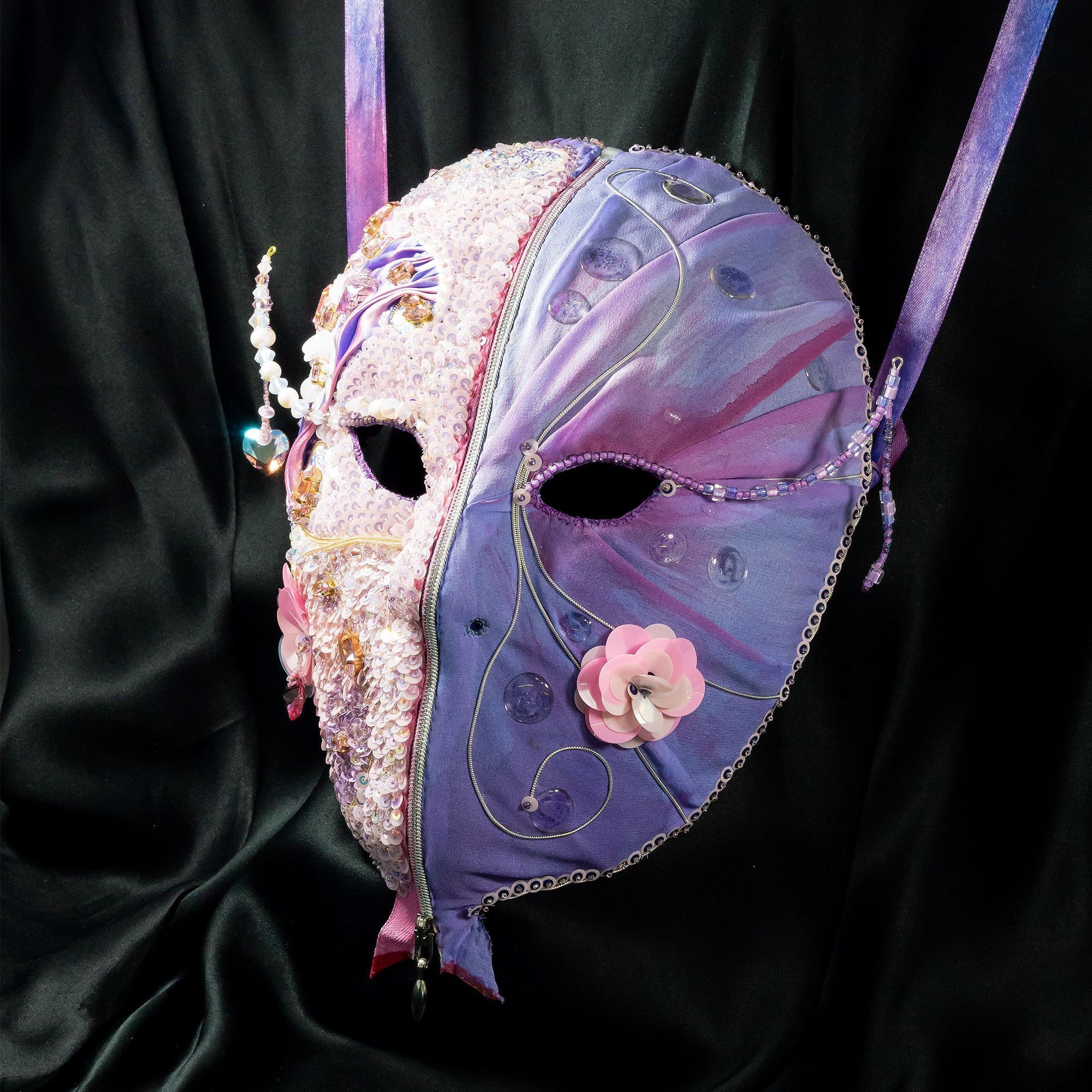 Маска создана с нуля, основа ее достаточно гибкая и мягко обнимает лицо при носке, но при этом самостоятельно держит форму. В целом виде крепится на голове лентами. С помощью молнии разделяется на две половинки, каждая из которых функциональна и может быть использована по отдельности. В этом случае для носки используется окрашенная в цвета маски палочка.