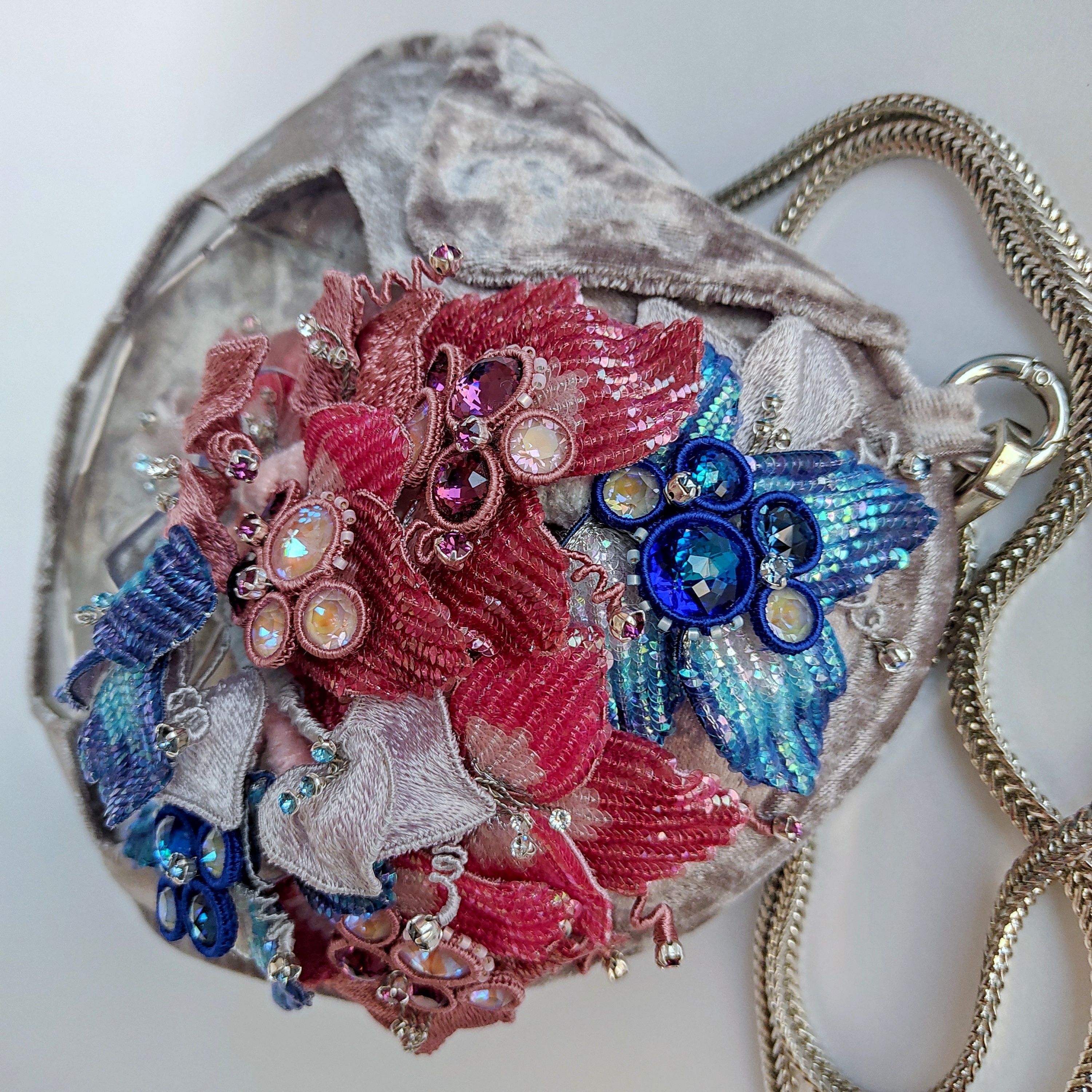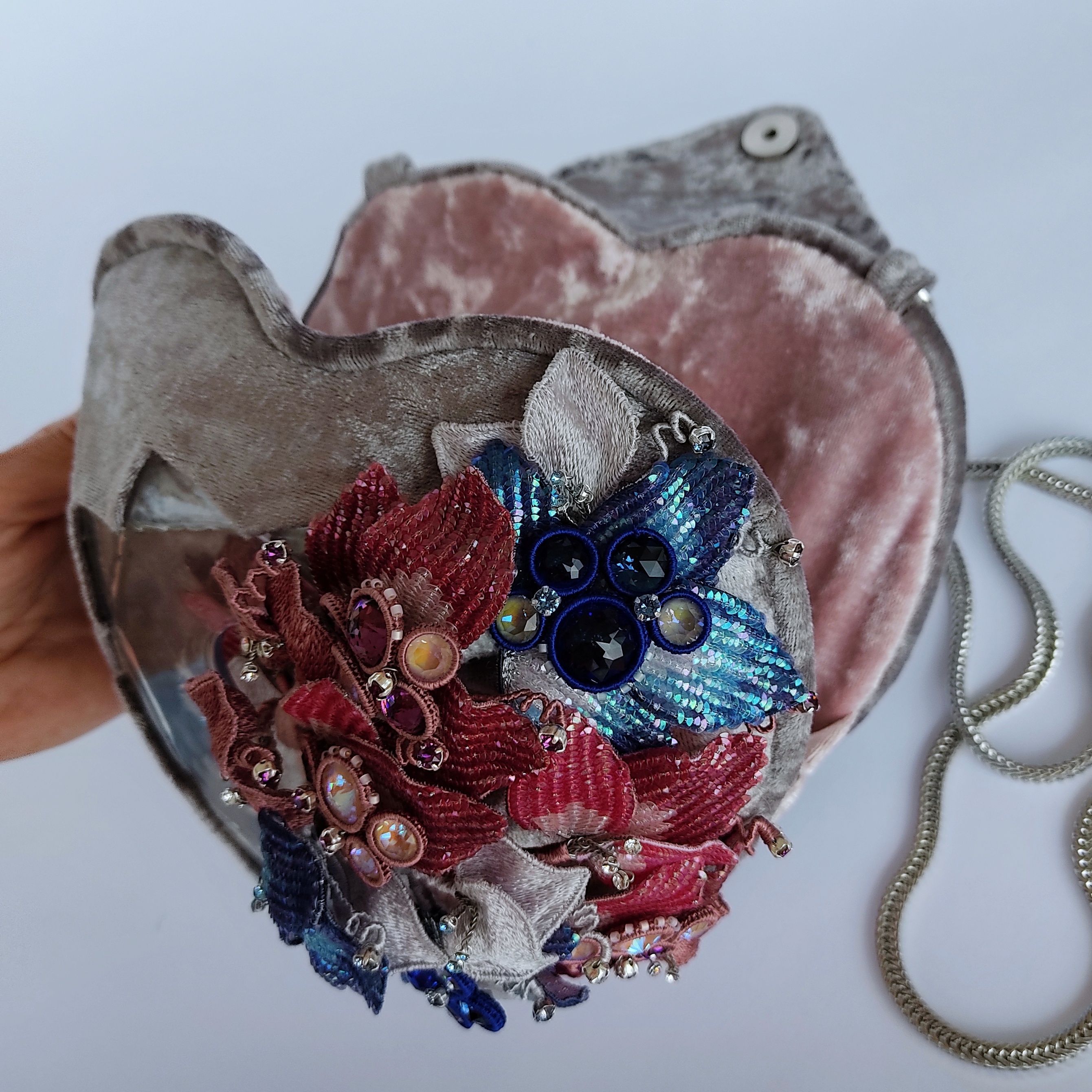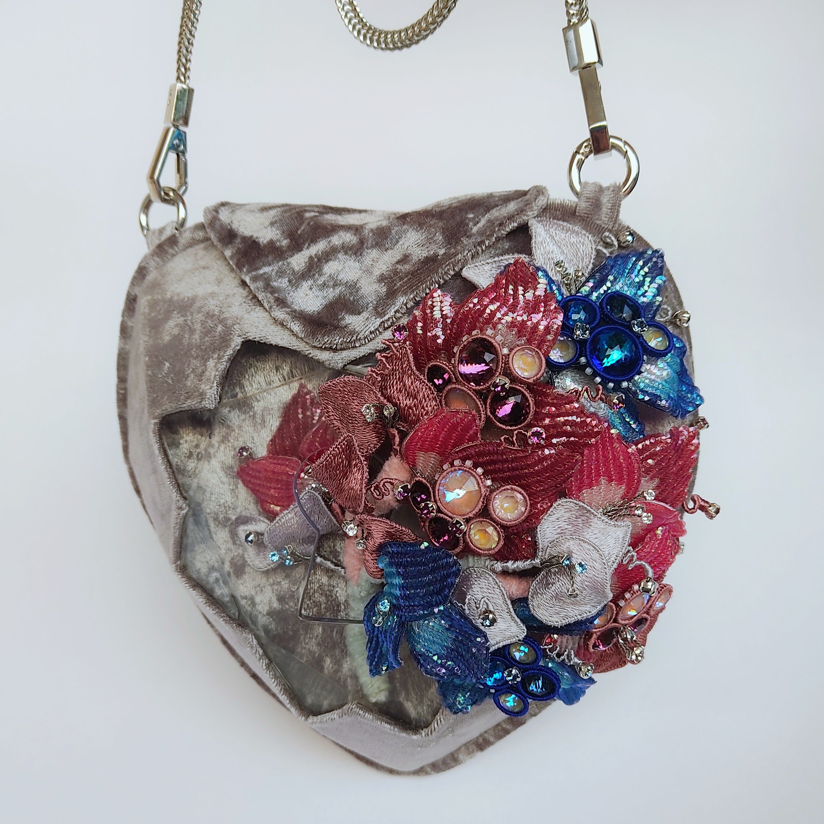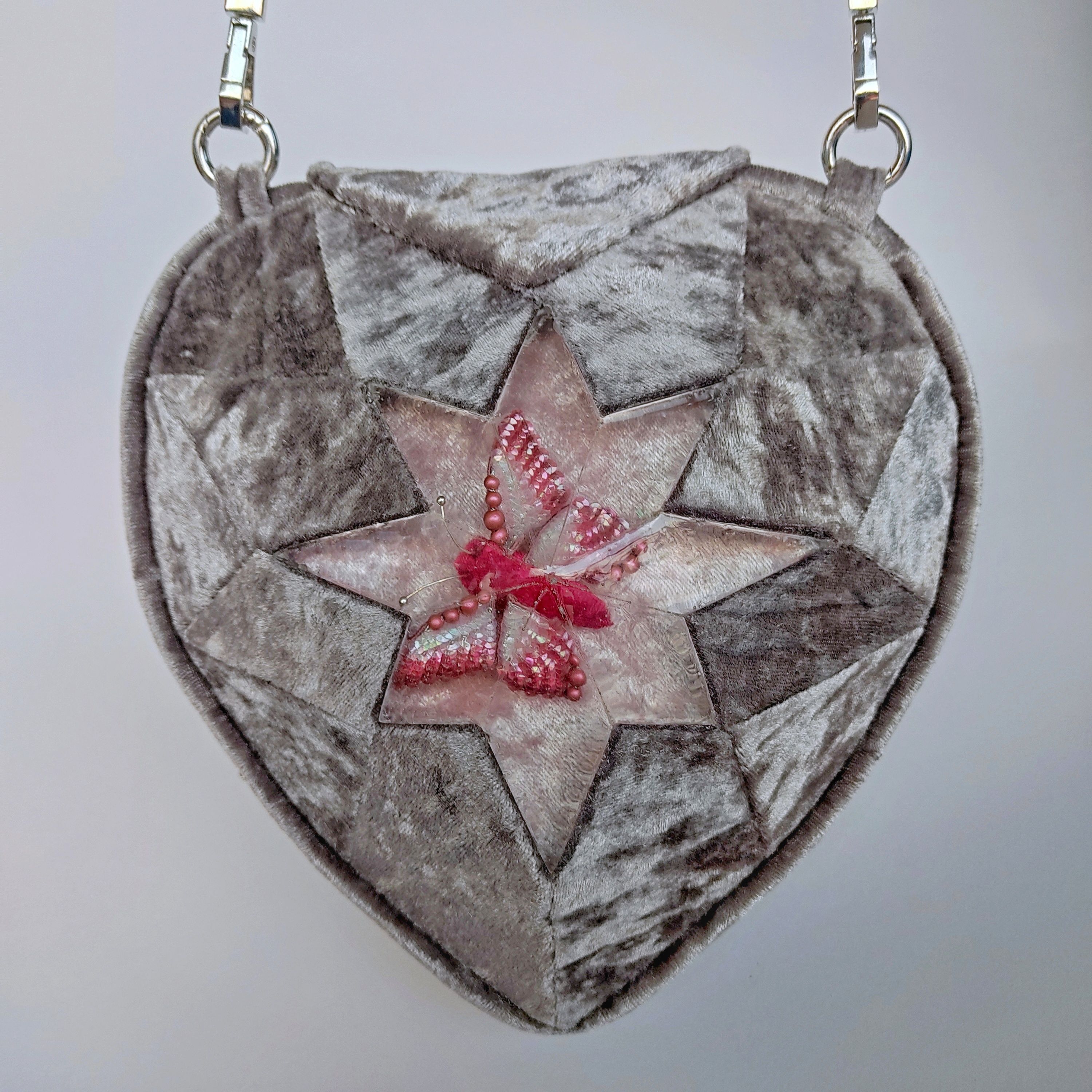 Сумочка выполнена из бархата в виде кристалла в форме сердца, с использованием эпоксидной смолы.