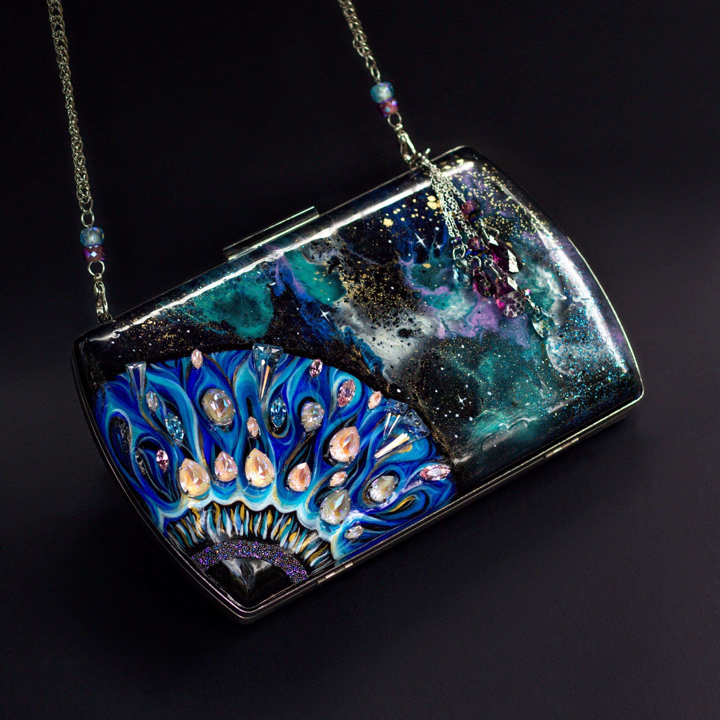 Последняя коллекция Swarovski 2022 "в поисках нового" меня натолкнула на использование новых технологий в декоре сумочки. Здесь сочетаются художественная роспись акриловыми красками и резин-арт (эпоксидная смола), абстракция и конкретика, глянцевые поверхности с блеском страз и кристальной ткани.