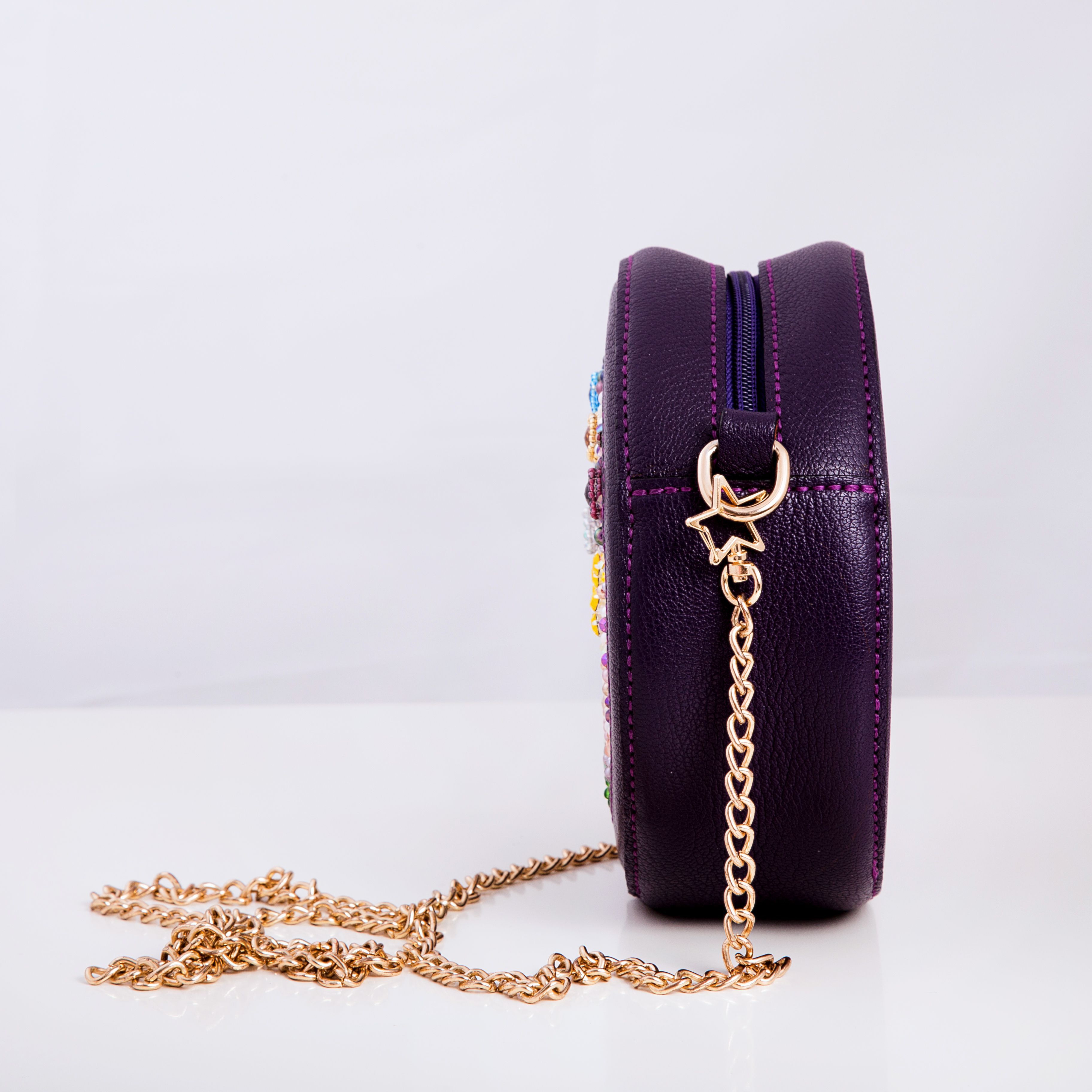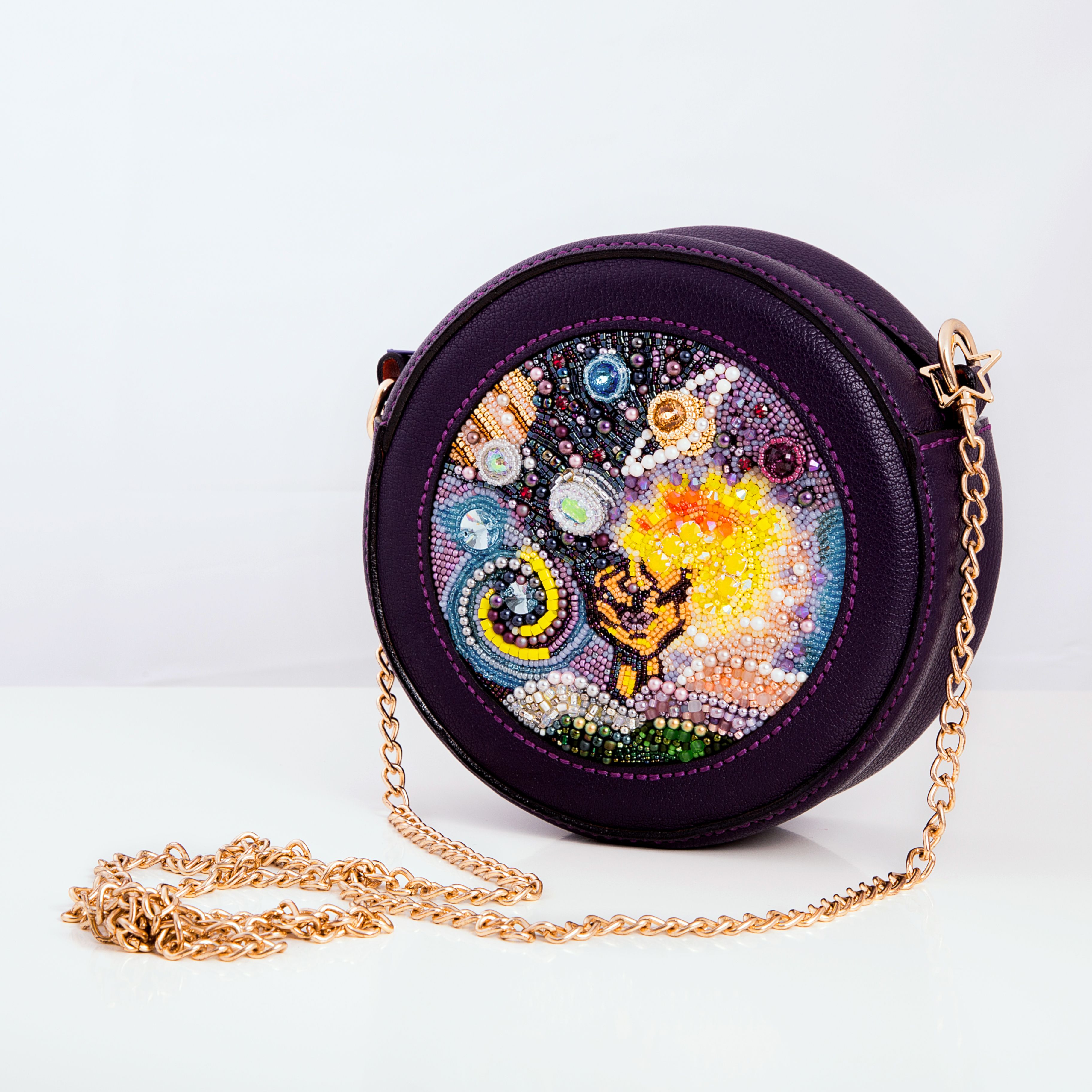 Форма сумки – круг – тоже использована не просто так. Круг имеет огромное количество символов, но я в своей работе применила значение целостности, непрерывности. Хотелось передать идею того, что невозможно разделить человека на отдельные составляющие. Ведь он есть то, как он ощущает и понимает этот мир.