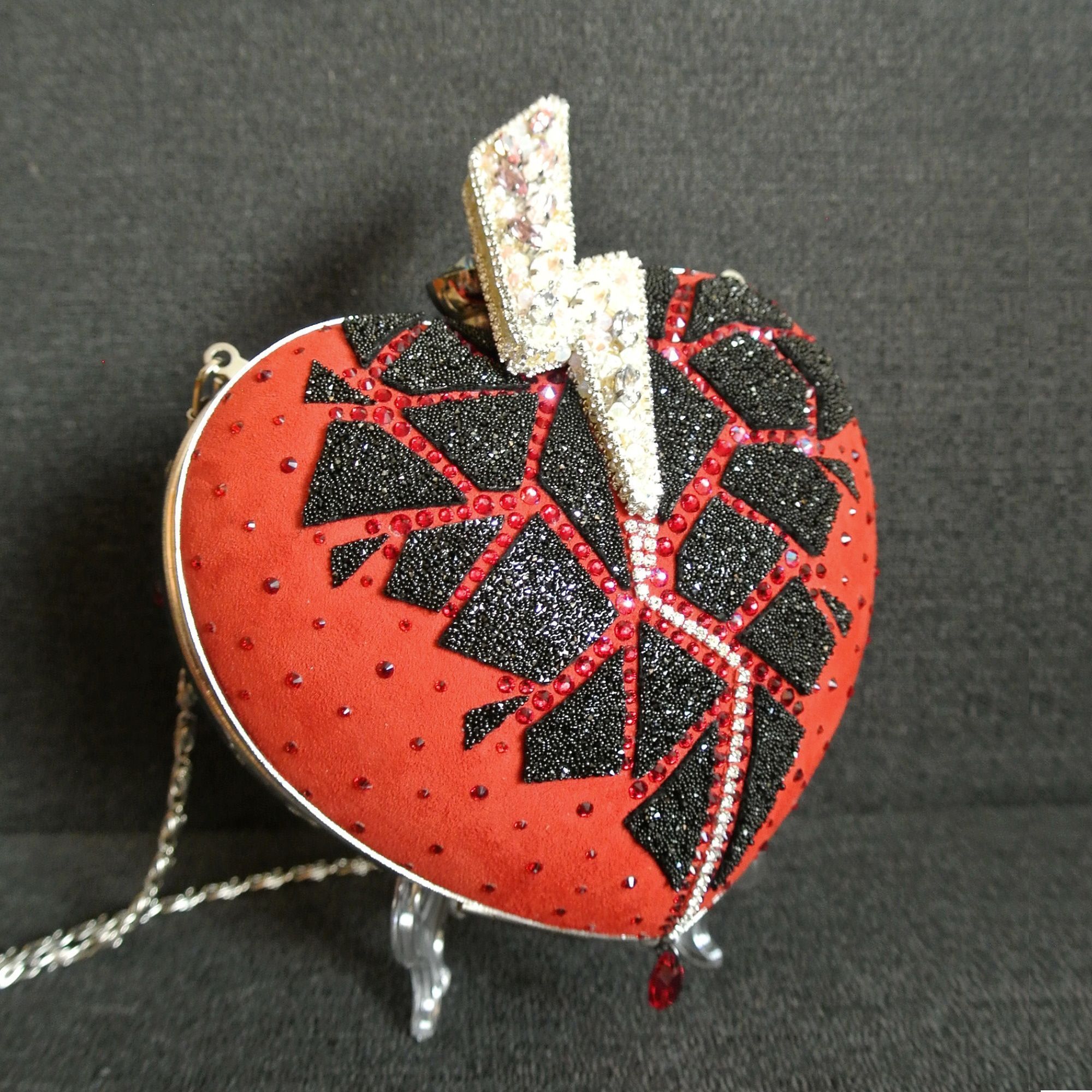 В наши сердца как будто ударила молния, и они почернели от горя. Моя сумочка символизирует такое сердце рукодельницы. Молния вся сияет кристаллами Swarovski. В месте удара сердце покрылось обугленной коркой, которая потрескалась, и в трещинах сверкают капли крови. Сердце плачет…