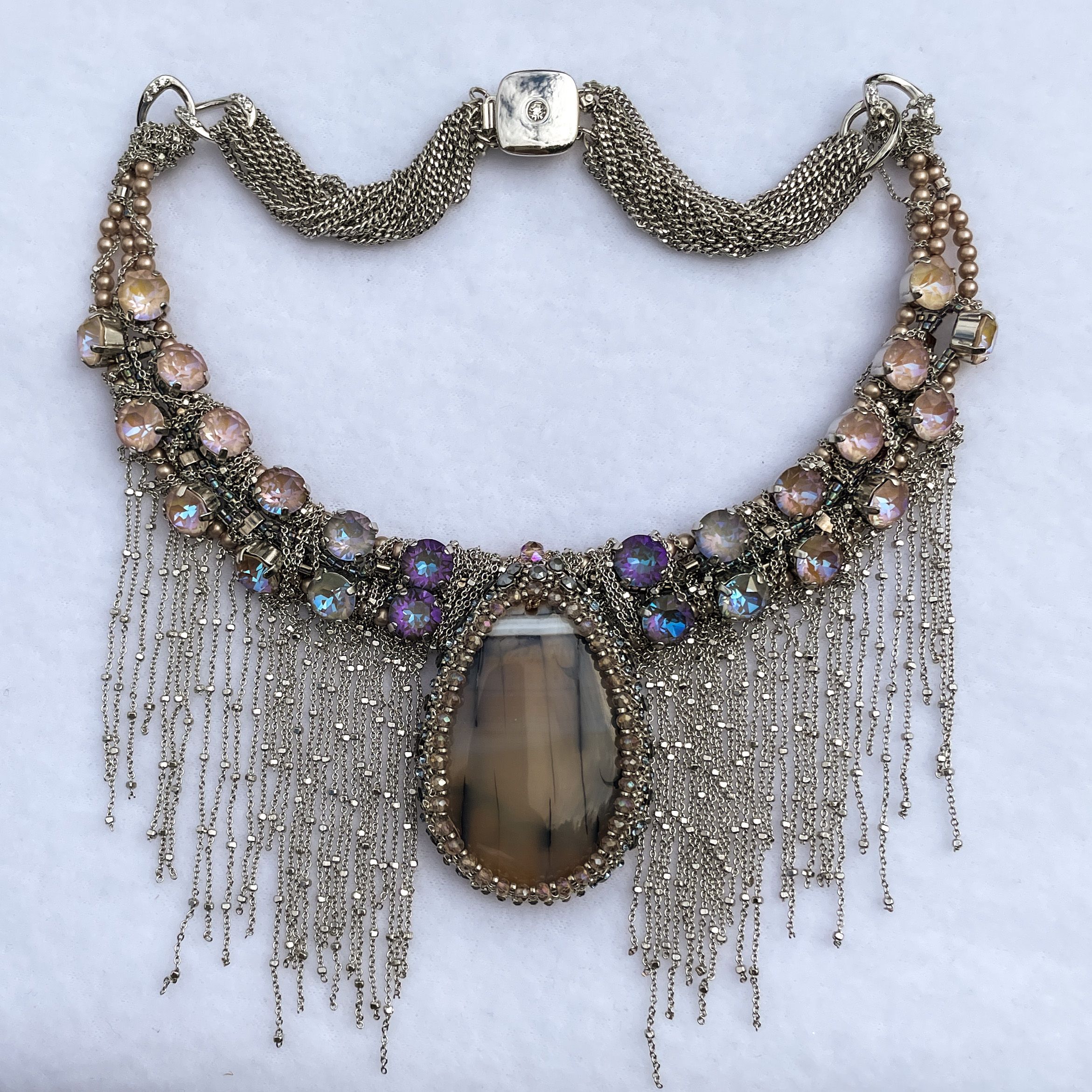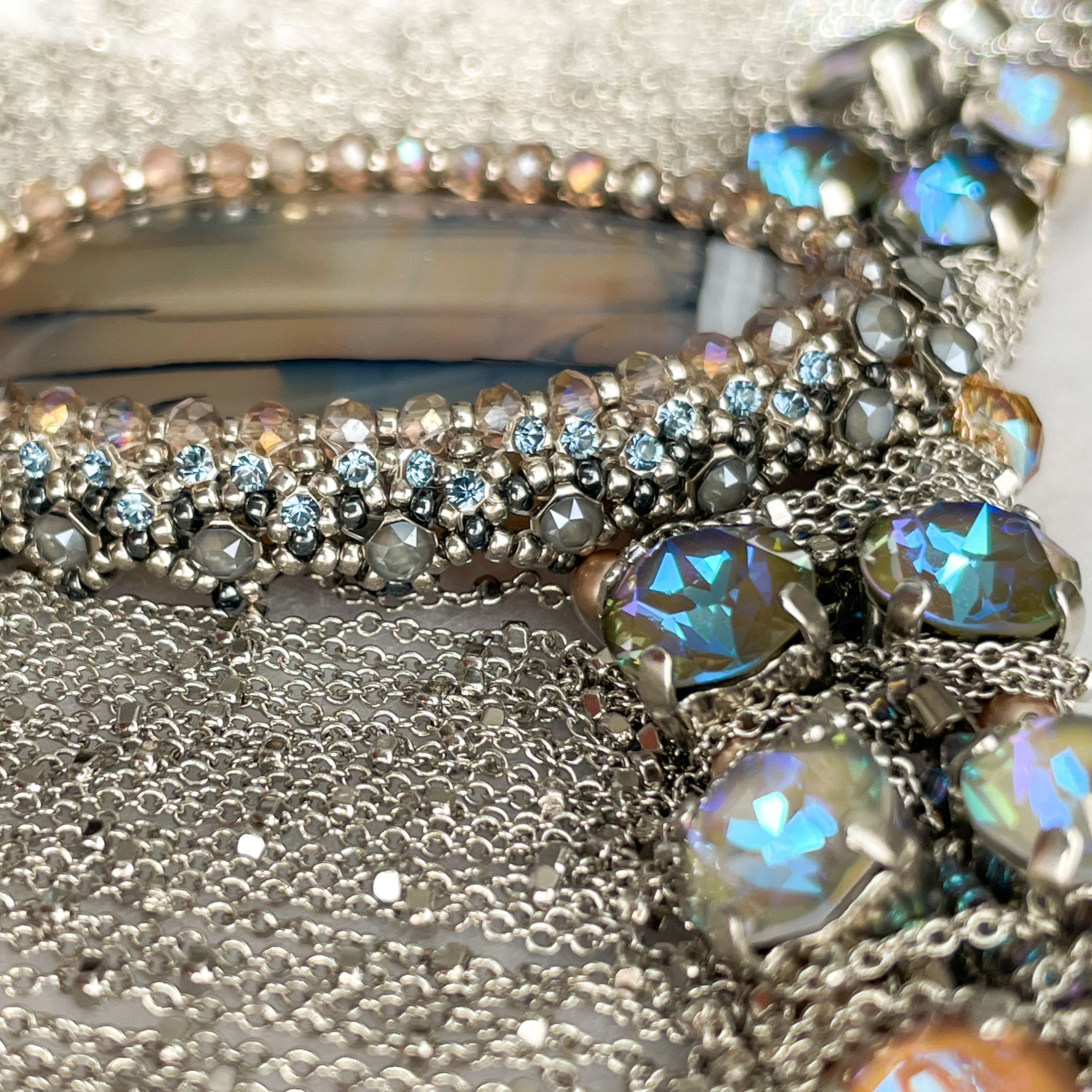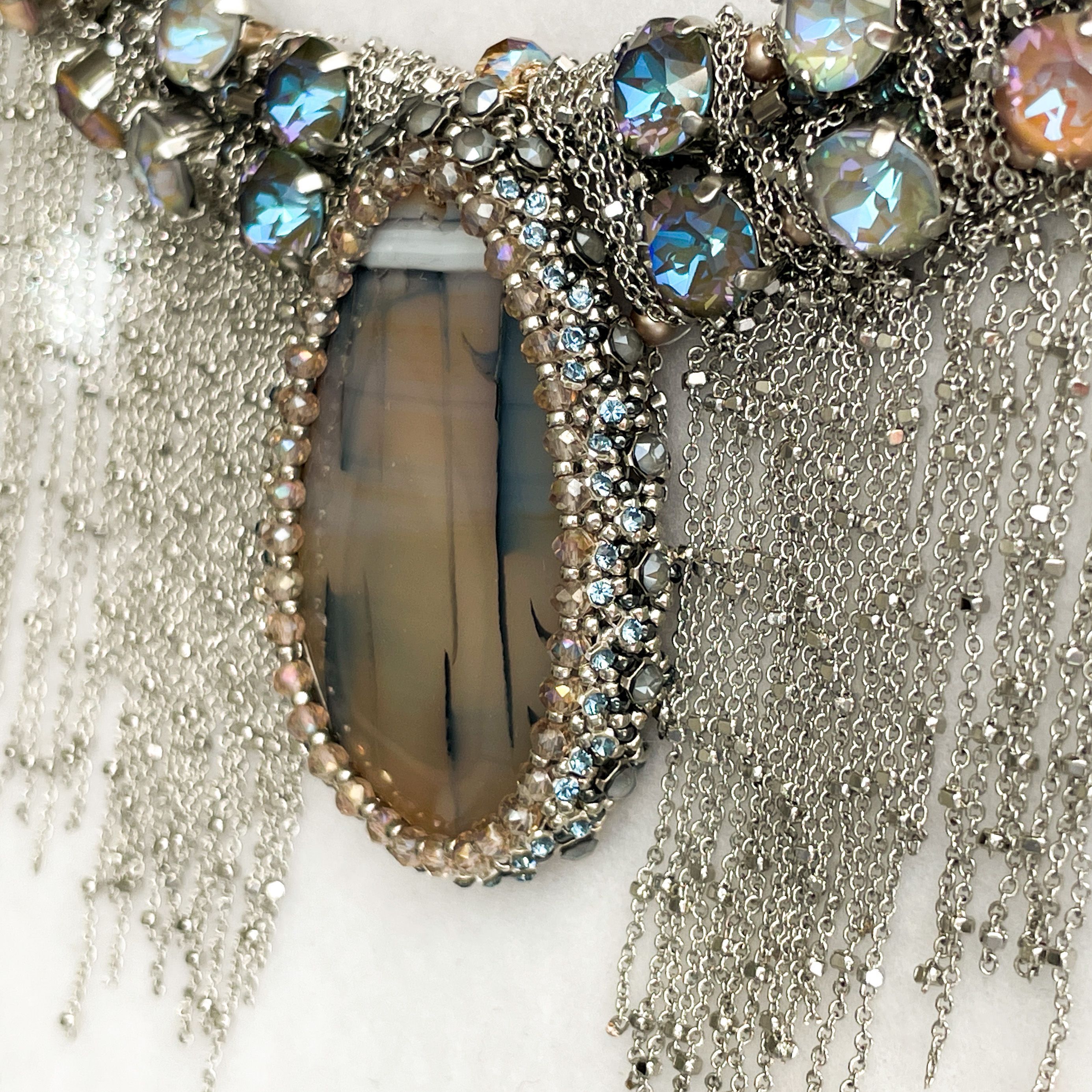 Мы всегда стоим перед выбором, и каждое наше действие запускает определённую цепочку событий. Так и в колье Crystal Vibes каждое наше движение, наклон или поворот, повторяется в бликах кристальных граней и в струящихся утонченных цепочках. Нежнейший градиент приглушённых тонов кристаллов, повторяющийся лейтмотивом в центральном элементе, подчёркивает изысканный аристократичный вкус обладательницы этого колье: она словно снизошла к нам прямо посреди королевского приема, ее образ дополняет высокий парик, веер и платье с открытым декольте и сотнями слоёв пышных юбок.