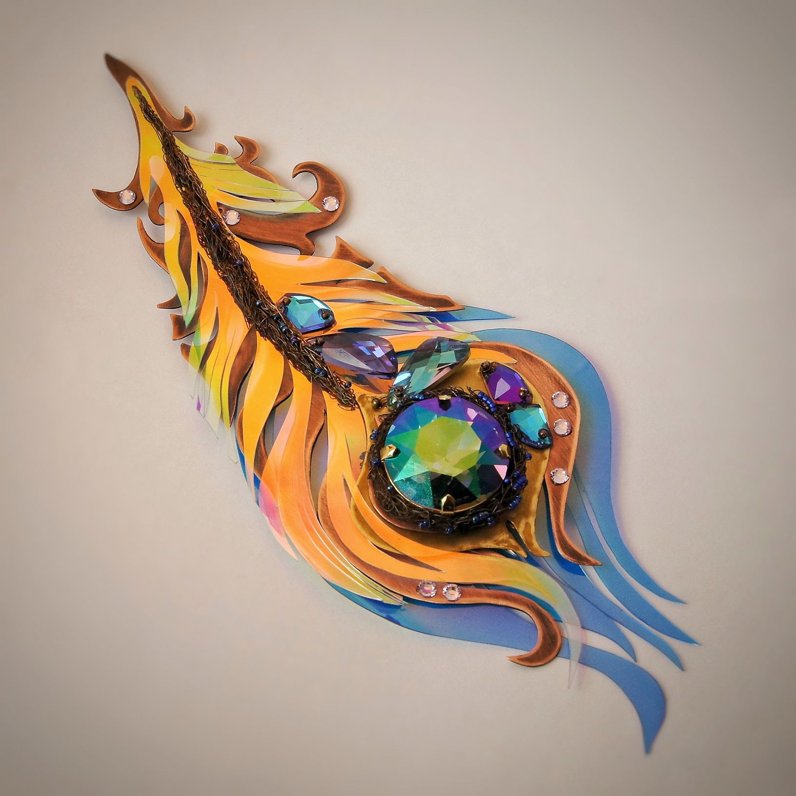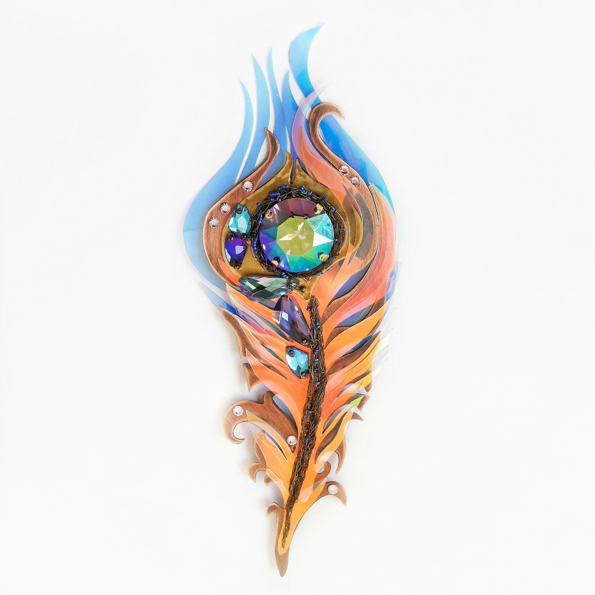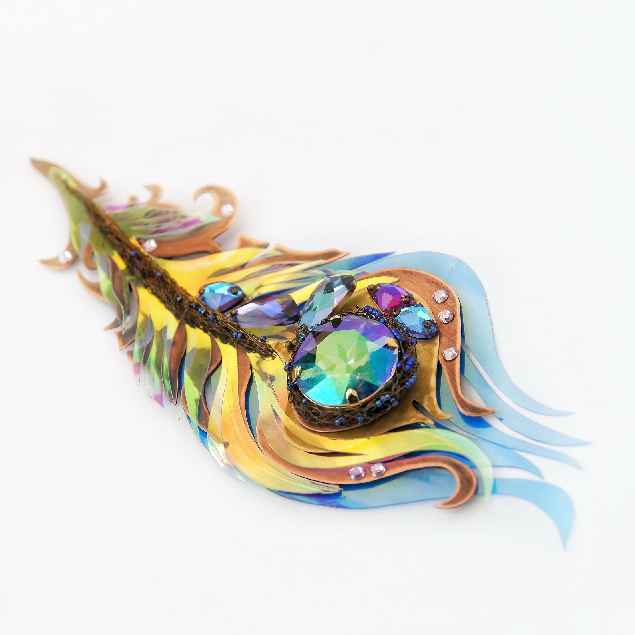 Крупная, необычная брошь выполнена в виде пера. Яркое, сверкающее, переливающееся. Меняет цвет в зависимости от освещенности и окружающих предметов и цветов. Никогда не остается одинаковым. Притягивает взгляд. Настоящее перо волшебной птицы!