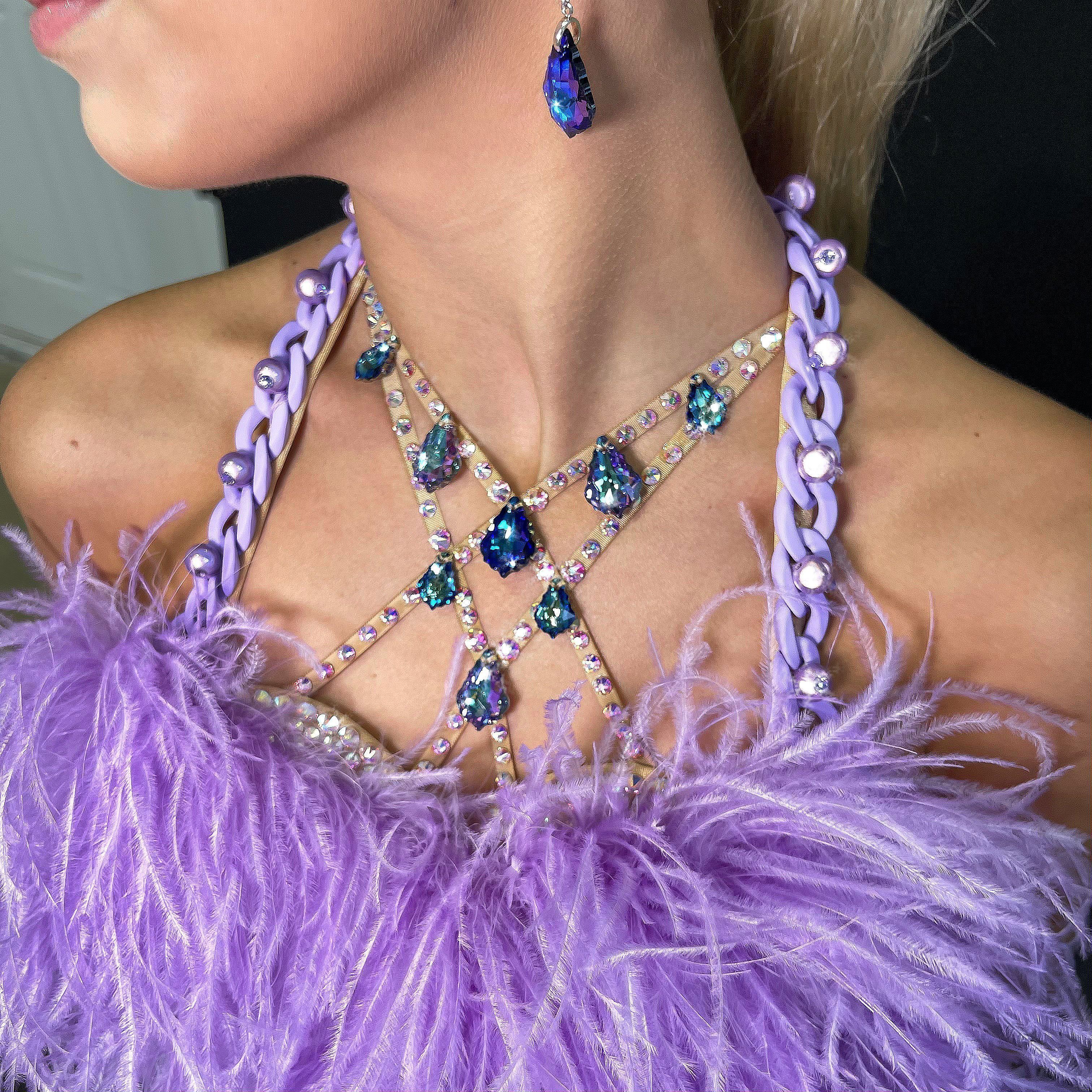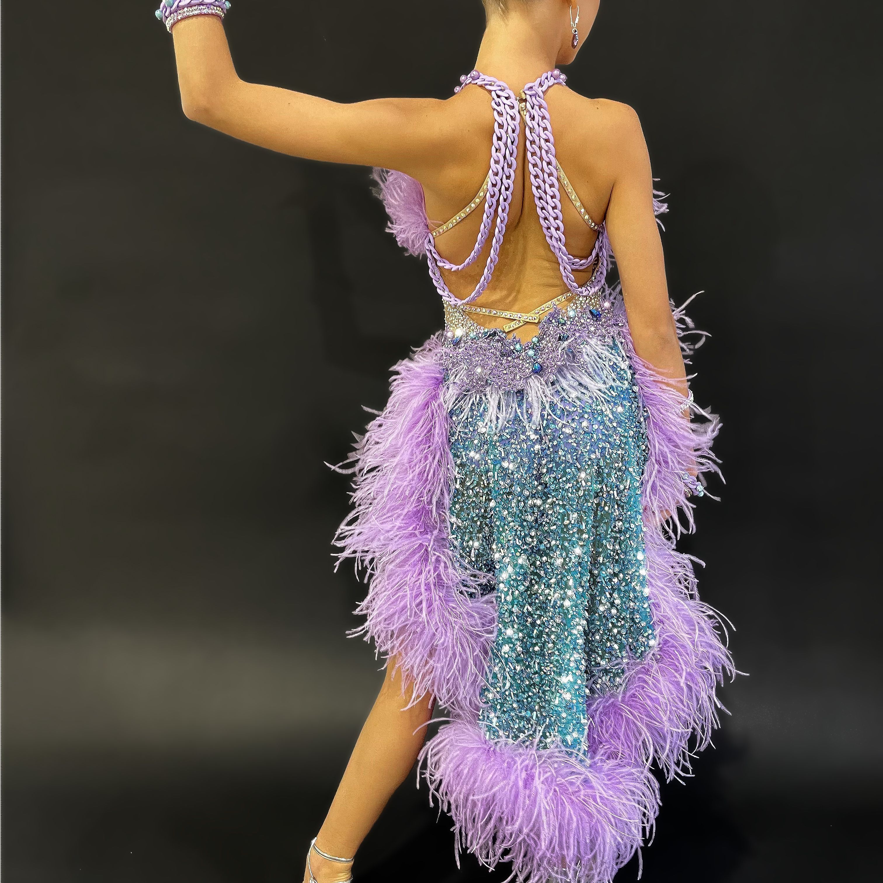 Благородный перелив барочных кристаллов Vitrail Light и Heliotrope. Сияние страз с непревзойдённым эффектом Aurora Borealis. Ручная вышивка,  лёгкие струящиеся перья цвета Lilac. Всё это раскрывает  страсть, нежность и изящность моей работы. В движении под звуки румбы или ча-ча-ча можно увидеть как раскрываются грани вселенной .EVOLI