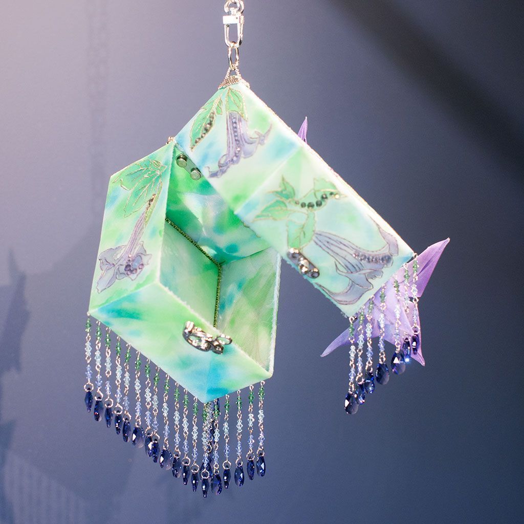В моей вселенной .evoli я рассуждаю о связи конструкции и свободной формы. Есть два типа творцов - люди потока и люди расчета. Я принадлежу второму лагерю, все строится, конструируется и вымеряется. Однако первый подход имеет очевидные преимущества, поэтому в каждой работе я стремлюсь к балансу хотя бы на уровне идеи. Например здесь грани .evoli воплощены в максимально точном искусстве - оригами и в минимально подходящем для жесткой формы материале - ткани. К космическим мотивам отсылает фон росписи в технике холодного батика, а также образ цветка-дурмана. Ну и разумеется декор кристаллами .evoli в лавандовом оттенке.