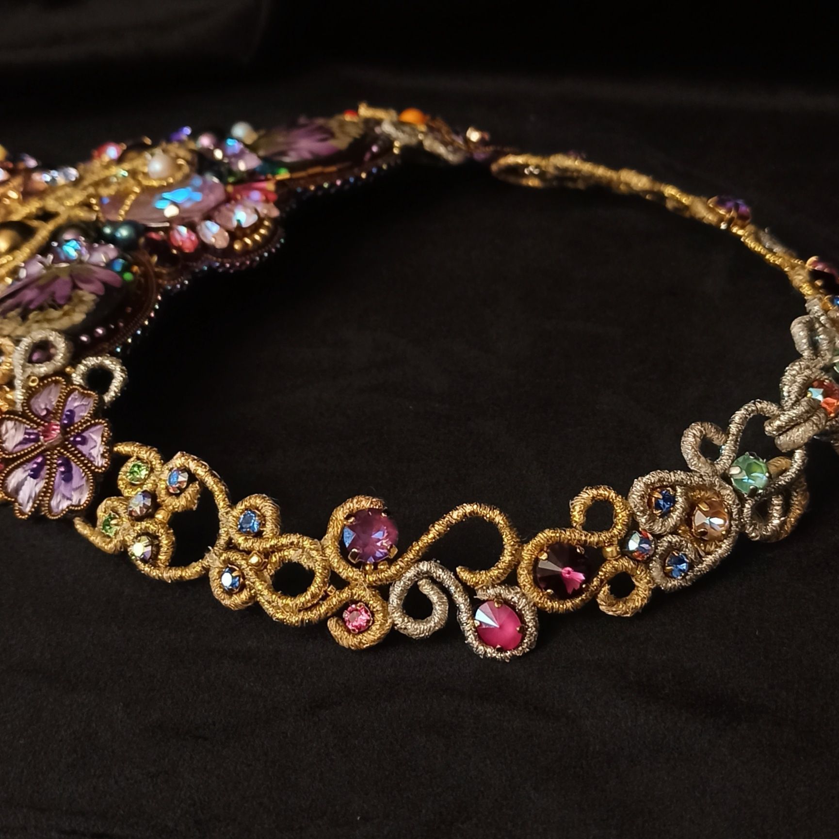 Когда была начата работа над этим колье, я не знала что получу в итоге. Конечно была задумка, эскизы, подбор кристаллов и жемчуга, но перечитывая название темы "Грани Вселенной .evoli" Раз за разом, я всё больше понимала, что хочу чтобы материалы мной "управляли". Глядя на основные цвета я задумалась, что же они означают. Сиреневый олицетворяет творчество, воображение, таинственность. Творческие поиски, открытость к переменам и стремление к развитию. Золотой символизирует солнце, несёт в себе решительность к действиям, бесстрашие, желание выделиться. И я поняла что всё сходится! Именно в таком настроении я и пребывала, в поиске новой грани в себе, в решительности создать что-то необычное. Шаг за шагом, завиток за завитком, мысль за мыслью.. Так и появилось колье "Моя Вселенная". Его создание напомнило мне о том что граней великое множество не только в кристаллах, а в нас самих.. Каждый из нас и есть целая многогранная Вселенная. Такая разная, неповторимая, глубокая.. Это колье о том, что внутренний мир огромен и прекрасен, о любви, о вдохновении, о мечтах, о возможностях...