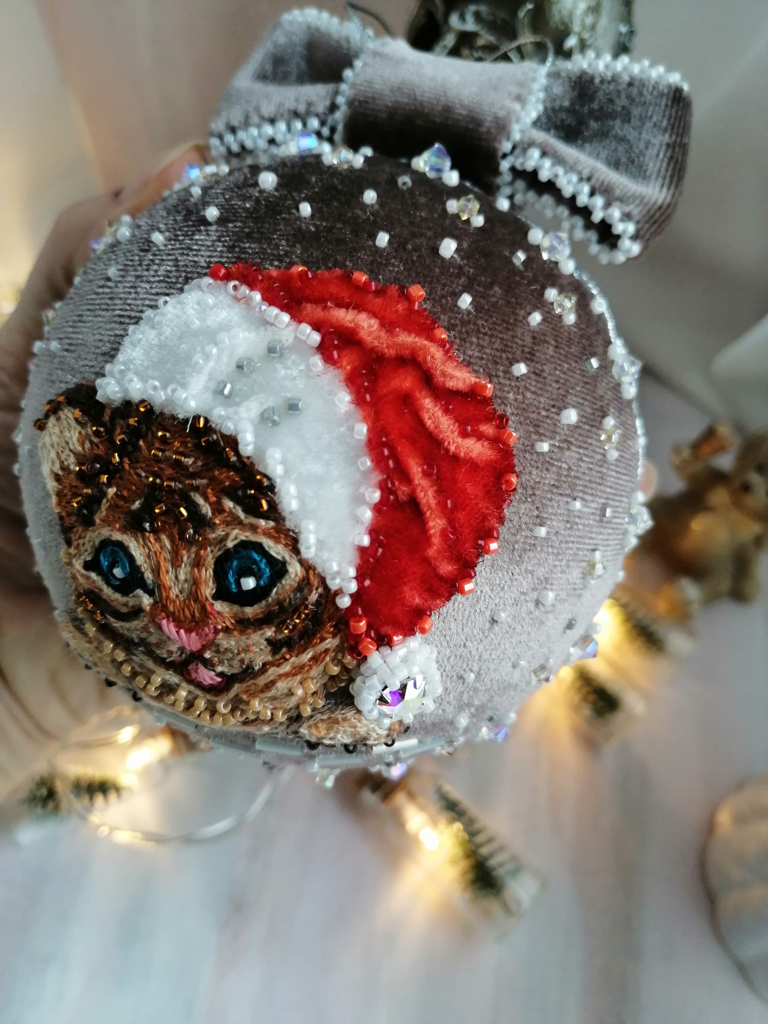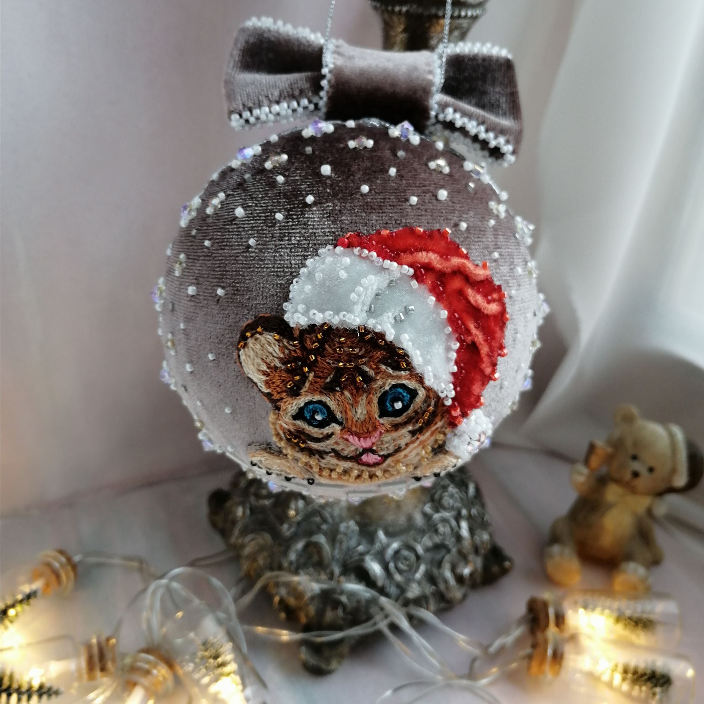 Ёлочная игрушка "Бархатный шар с тигренком"