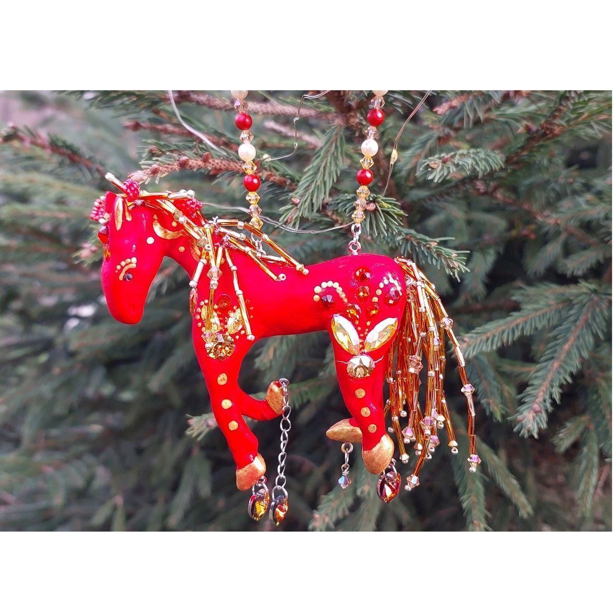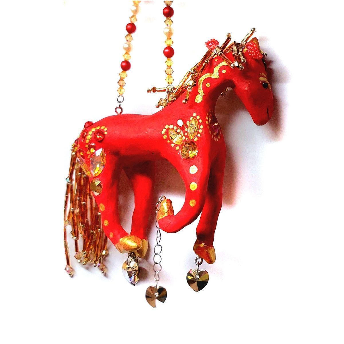 Кристаллы являются здесь частью игрушки, грива и хвост выполнены из бисера и