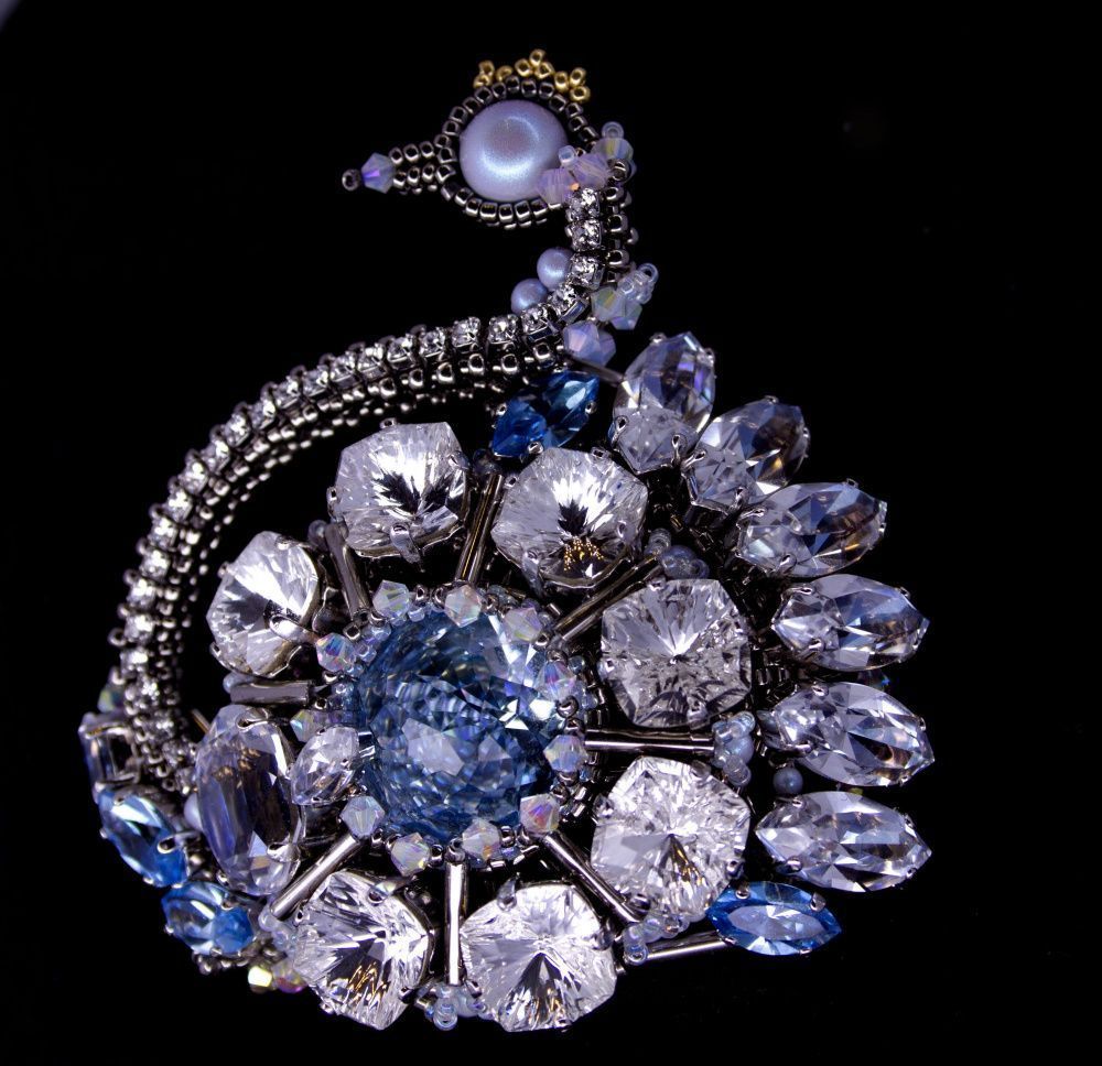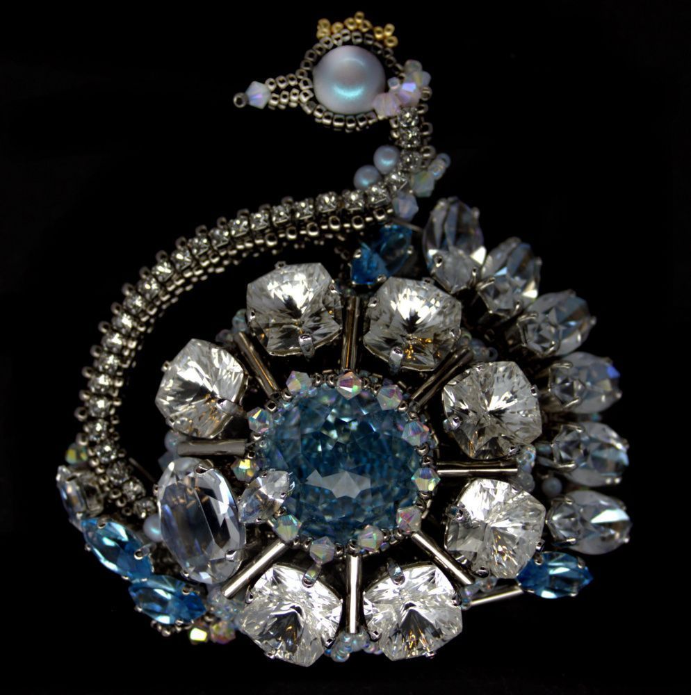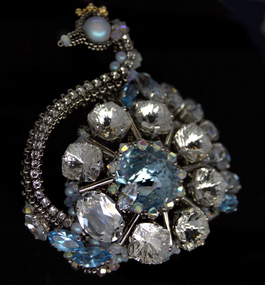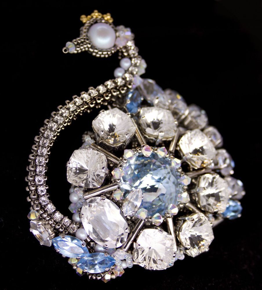 Эмблема Swarovski — лебедь, и мне захотелось представить ее в новом образе. Лебедь по своей величине, силе, красоте давно назван царём птиц. У него белоснежное оперенье. На длинной гибкой шее меленькая изящная головка. Движения птицы плавны, величавы. Лебедь невыразимо прекрасен, когда плывёт по гладкой поверхности воды.