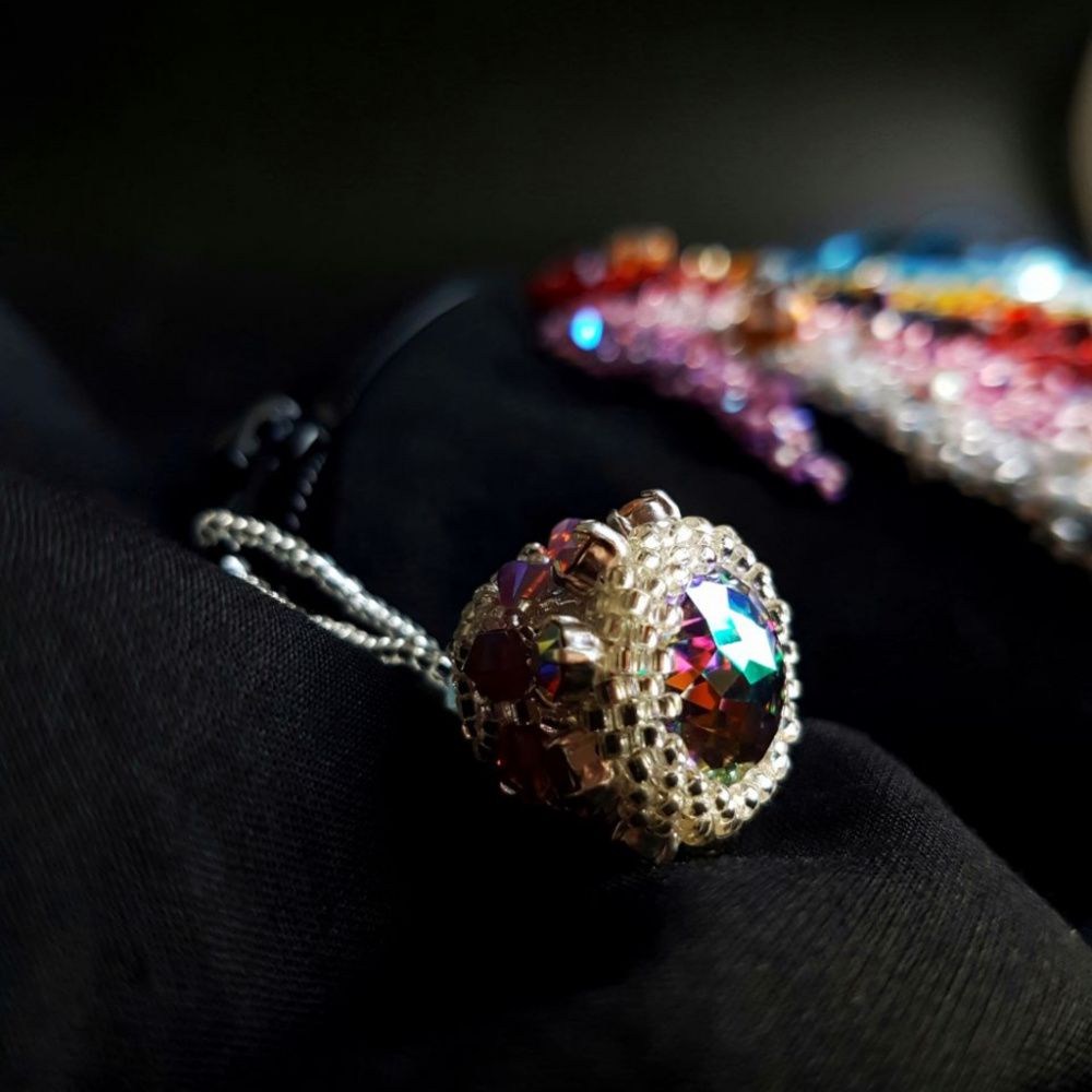 Когда вышла коллекция «Время сиять», я увидела кристаллы серии Ignite, и захотела воспользоваться их прозрачностью и подсветить их. После объявления темы конкурса, сомнений не было, работа должна сиять.
