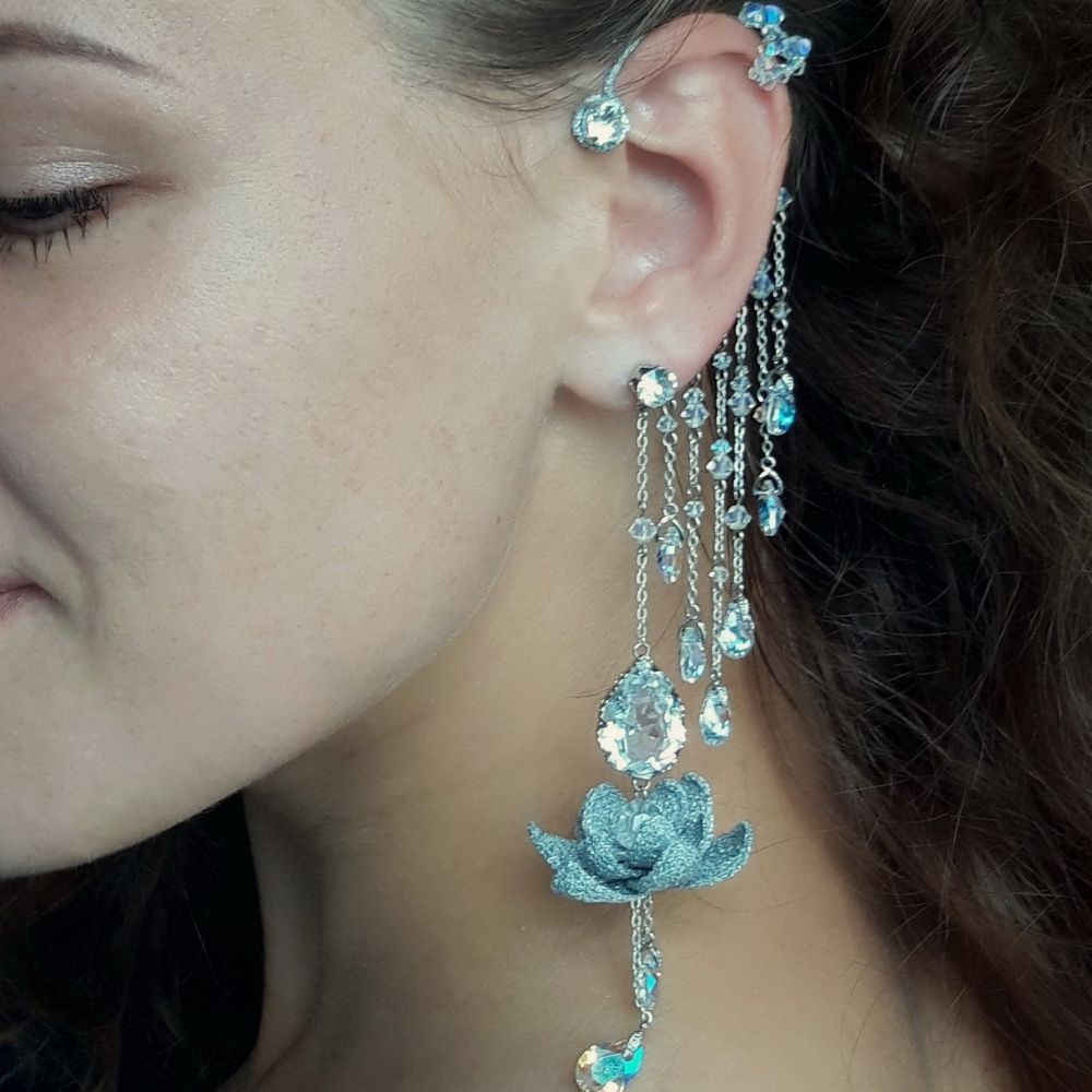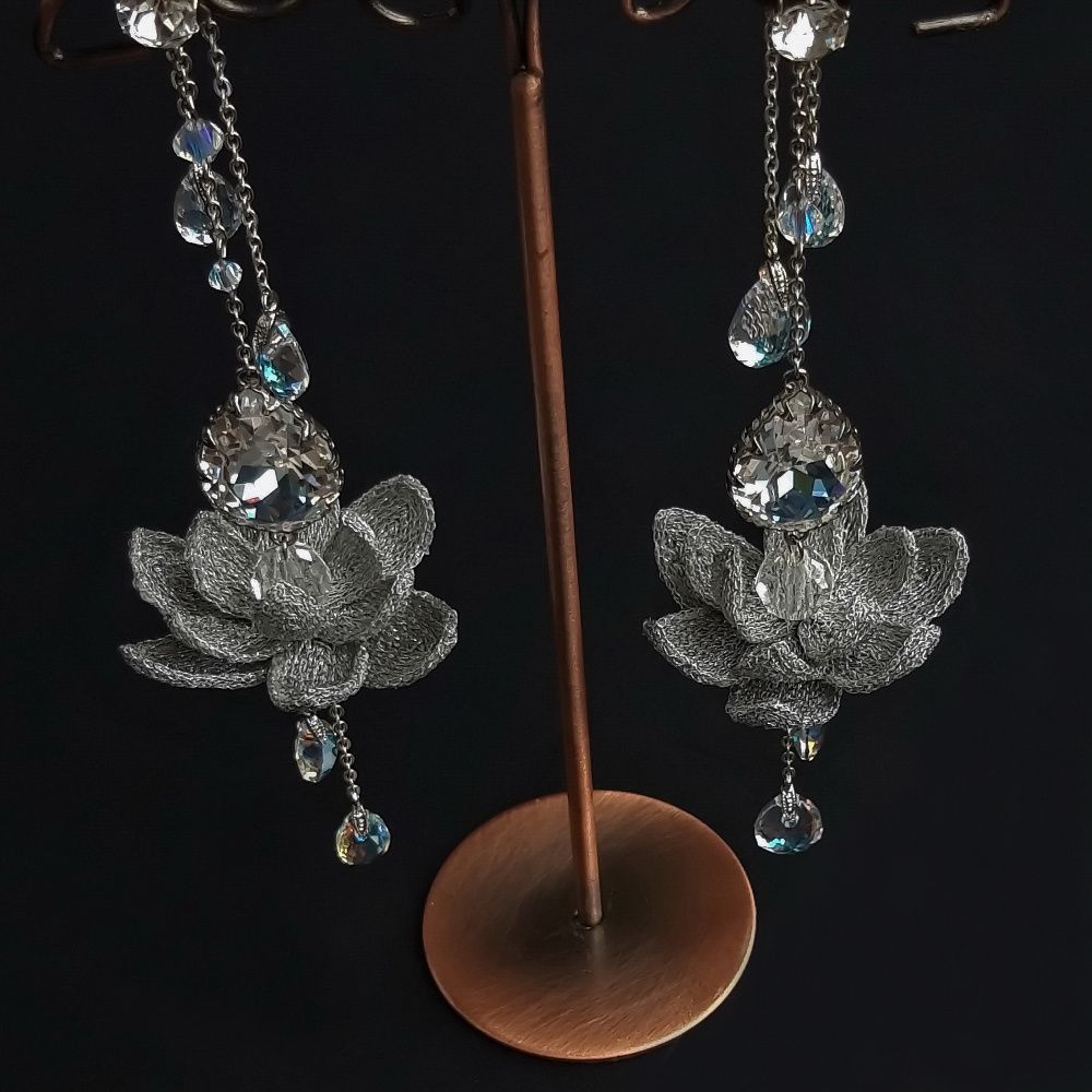 Крупные кристаллы-капли с эффектом Ignite хотелось оставить максимально открытыми, поэтому вправила их в спаянную самодельную оправу из безель-проволоки. Основные серьги с лотосами комбинируются с серьгой-каффом, маленькой серьгой-пуссетом и декоративными заглушками