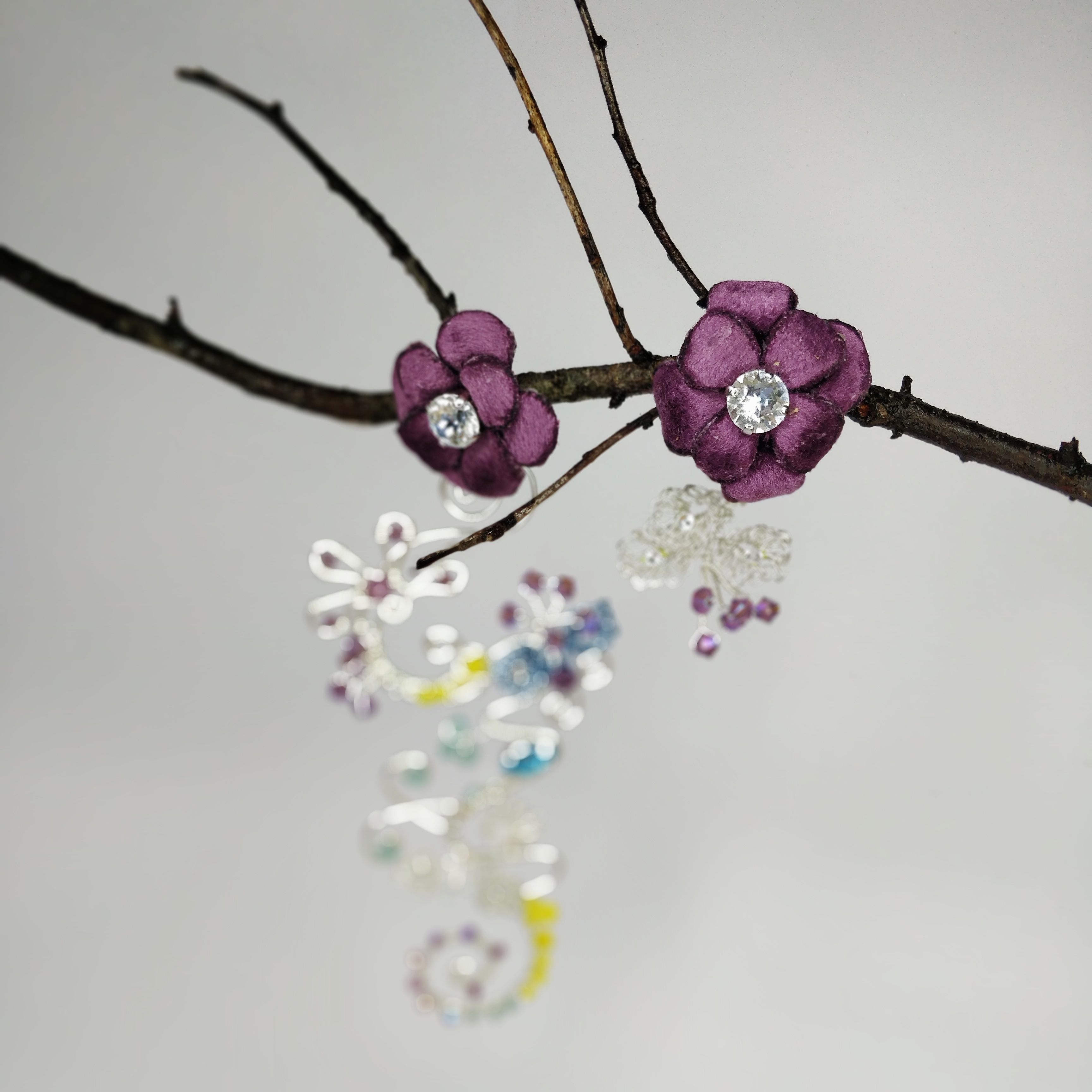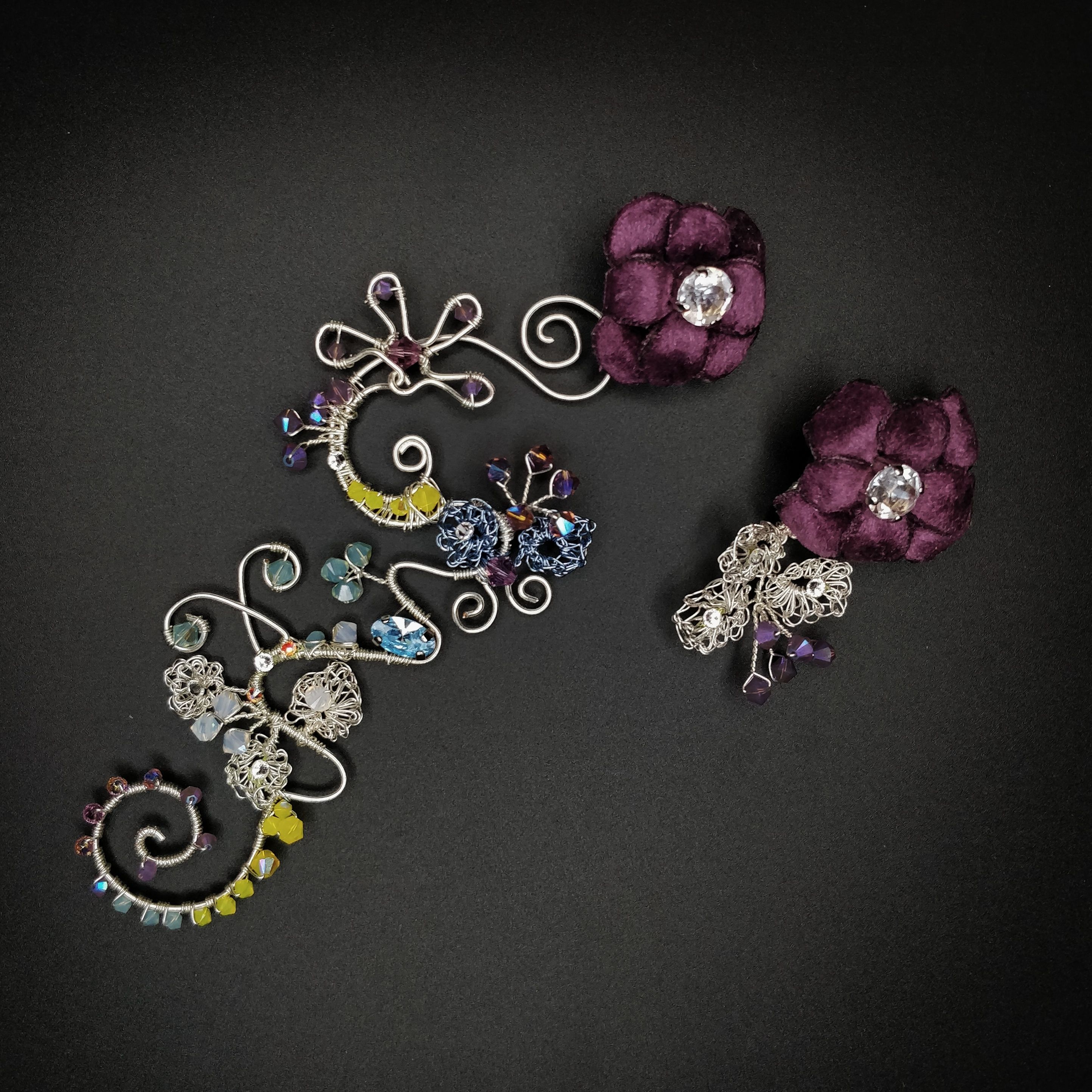 Август - это месяц смены времён года. Он разнообразен и эмоционален. Поэтому серьги "Сияние Августа" многогранны. Они богата смешением красок: от белого до темного аметистового, фактур: от нежного и теплого бархата до холодного металла, техник выполнения: плетение wire wrap, вязание.
