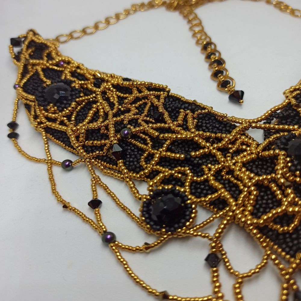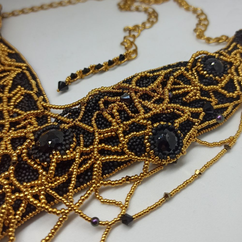 Мы привыкли к потрясающему блеску и сиянию кристаллов Swarovski. Но среди них есть и другие. Как черный бриллиант, кристалл Dome Round Stone цвета Jet, редкий и уникальный образец. Он абсолютно не пропускает свет и не даёт традиционного преломления в гранях, а его блеск исходит только от поверхности. Я выбрала кристалл не за его ослепительное сияние, а за его индивидуальность. Путь в мир драгоценностей черному бриллианту открыл амбициозный дизайнер ювелирных украшений Фаваз Груози, основатель ювелирного дома de Grisogono. А я решила придать огранку черным бриллиантам Swarovski! Этот кристалл приобрел новые грани сияния в блеске благородного золота. И я внутренне выросла, когда работала над этим колье, я хочу еще больше творить, развиваться и выбирать свои черные уникальные бриллианты придавая им огранку и сияние.