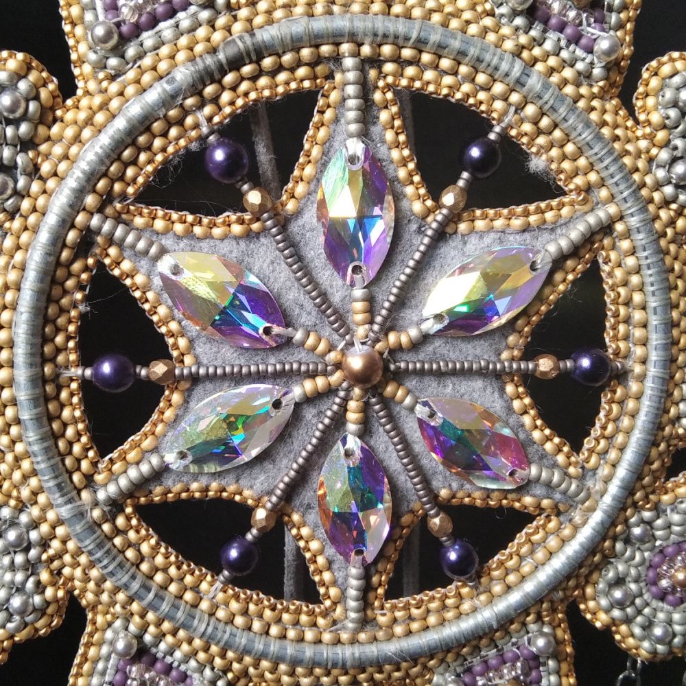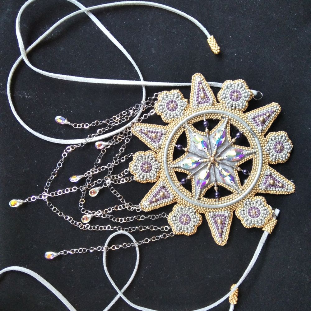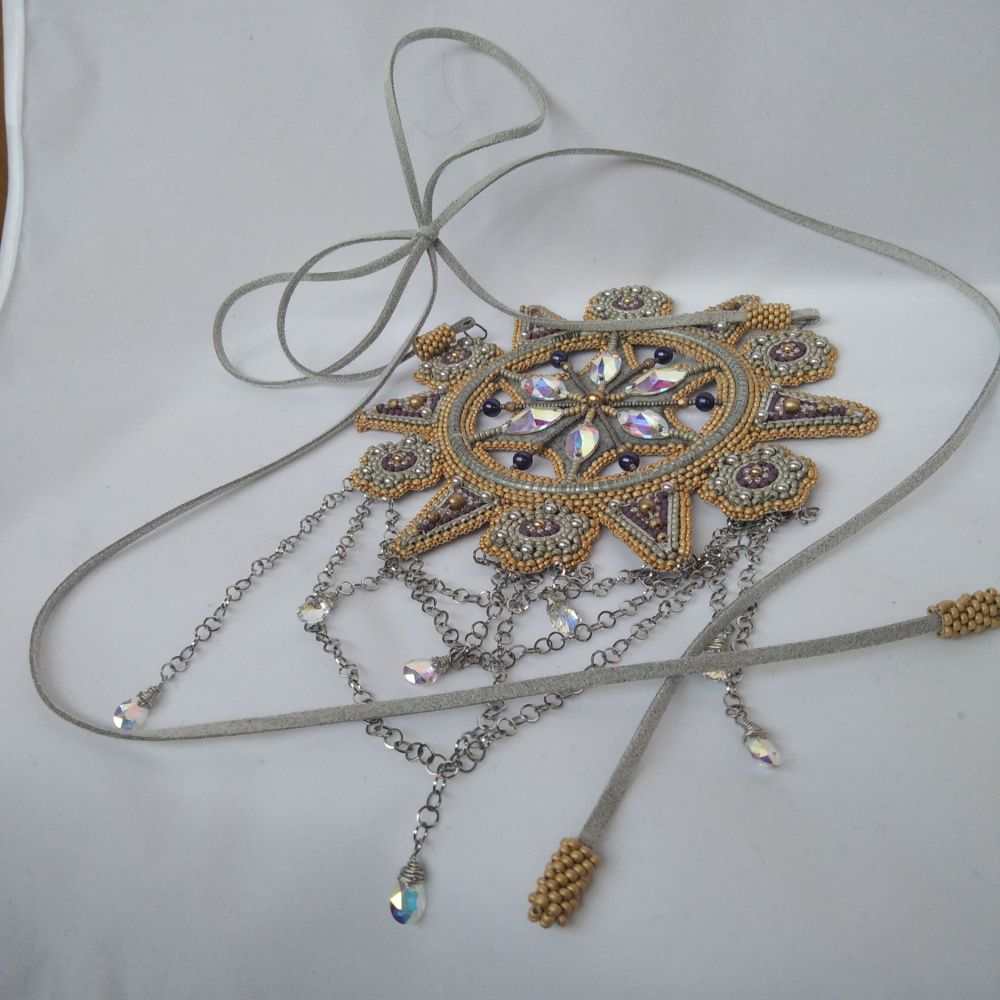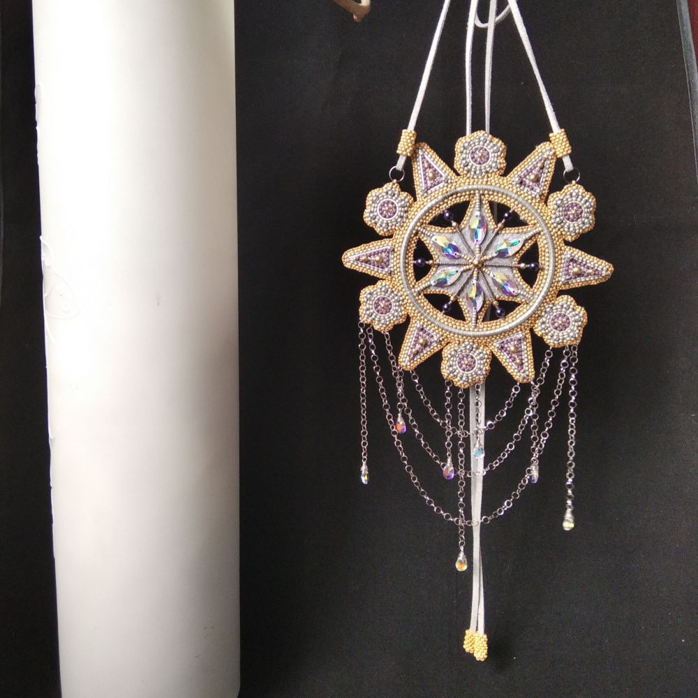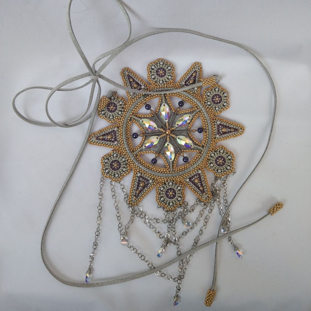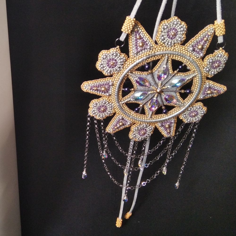 Я очень люблю придумывать фантазийные ловцы снов. Мое изделие может быть не только оригинальным аксессуаром, но и интерьерным украшением.  В многогранном сиянии кристаллов присутствует мощная нота фиолетового, поэтому я повторила фиолетовый и розовый во всей работе, к тому же я очень люблю эти цвета. Я люблю противостояние сталь/серый-золото, и их сочетание выглядит как интересное обрамление для радужных оттенков. Общая тональность изделия приглушенная, мягкая с повторяющимися орнаментами, подобно калейдоскопу, и хорошо подходит к модной бохо-стилистике, не говоря уже о символическом значении - ловец снов.