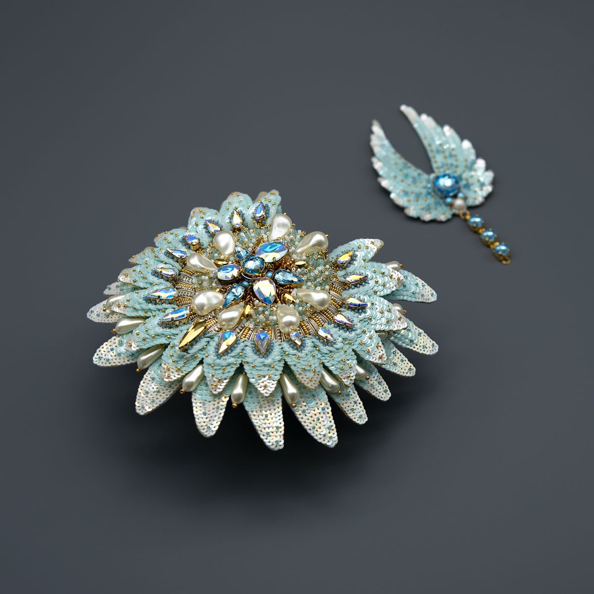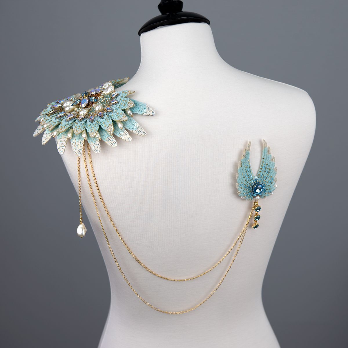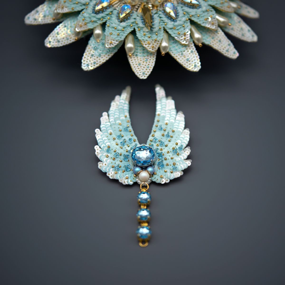 Нежно-голубая цветовая гамма, в сочетании с золотой фурнитурой, создает атмосферу небесной легкости и величия, а каплевидные и круглые кристаллы Swarovski напоминают слезы радости или капли росы, которые переносят нас в миры чудес и загадок. В своей работе я постаралась изящно переплести реальное ( фактуру, цвет)с фантастическим ( форма и содержание), выявляя тонкую грань между нашей природой и мистическими тайнами зазеркалья.