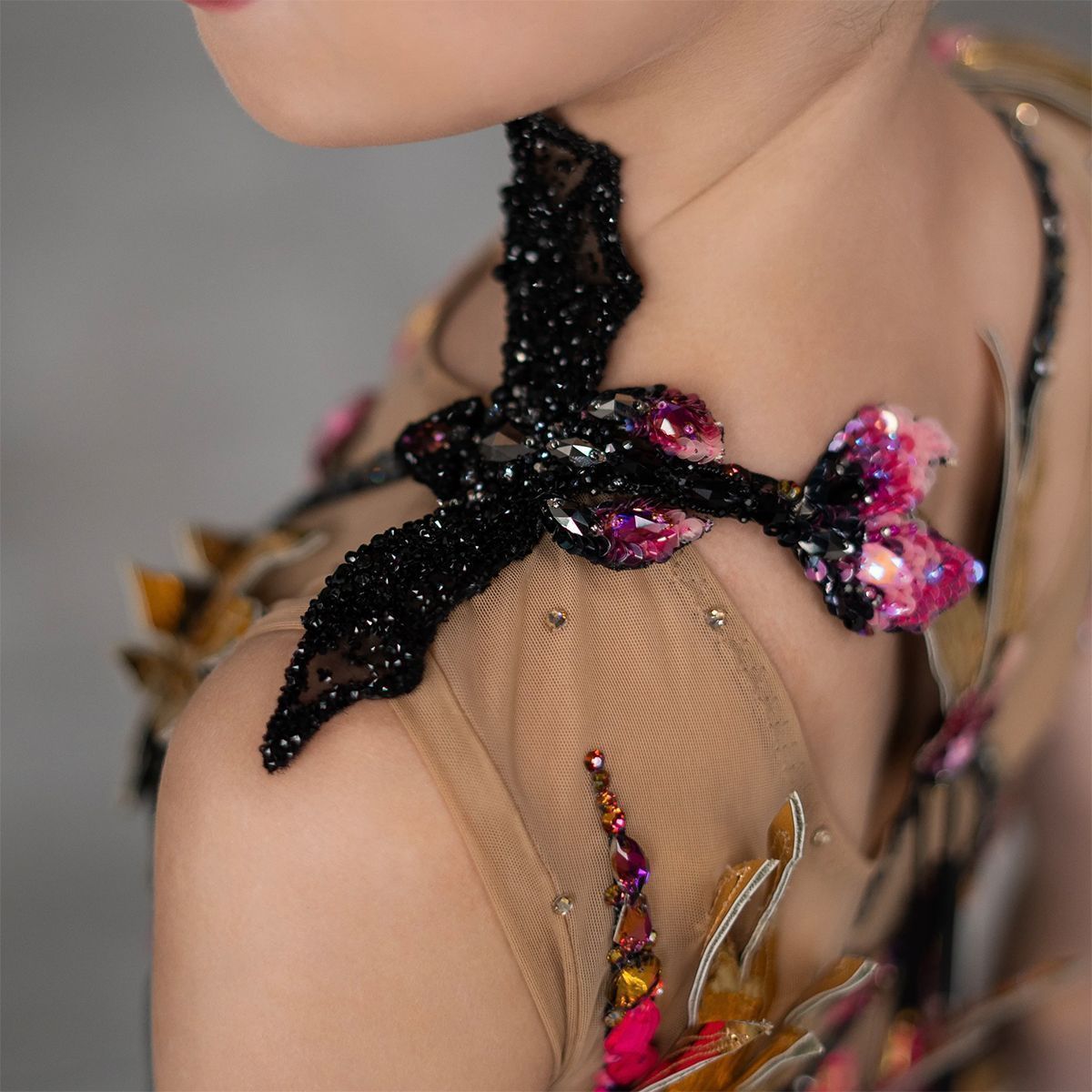 В работе используются итальянские пайетки и японский бисер. Дракон съемный, что делает купальник вариативным.