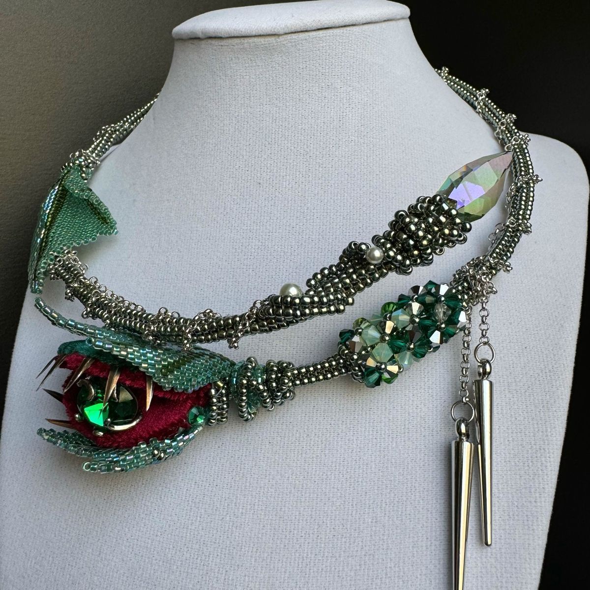 В моём Зазеркалье девушки украшают себя сказочными растениями, например «Дионея», украшение-«хищник», оно обвивает шею своей хозяйки с любовью, но может и уколоть её шипами.