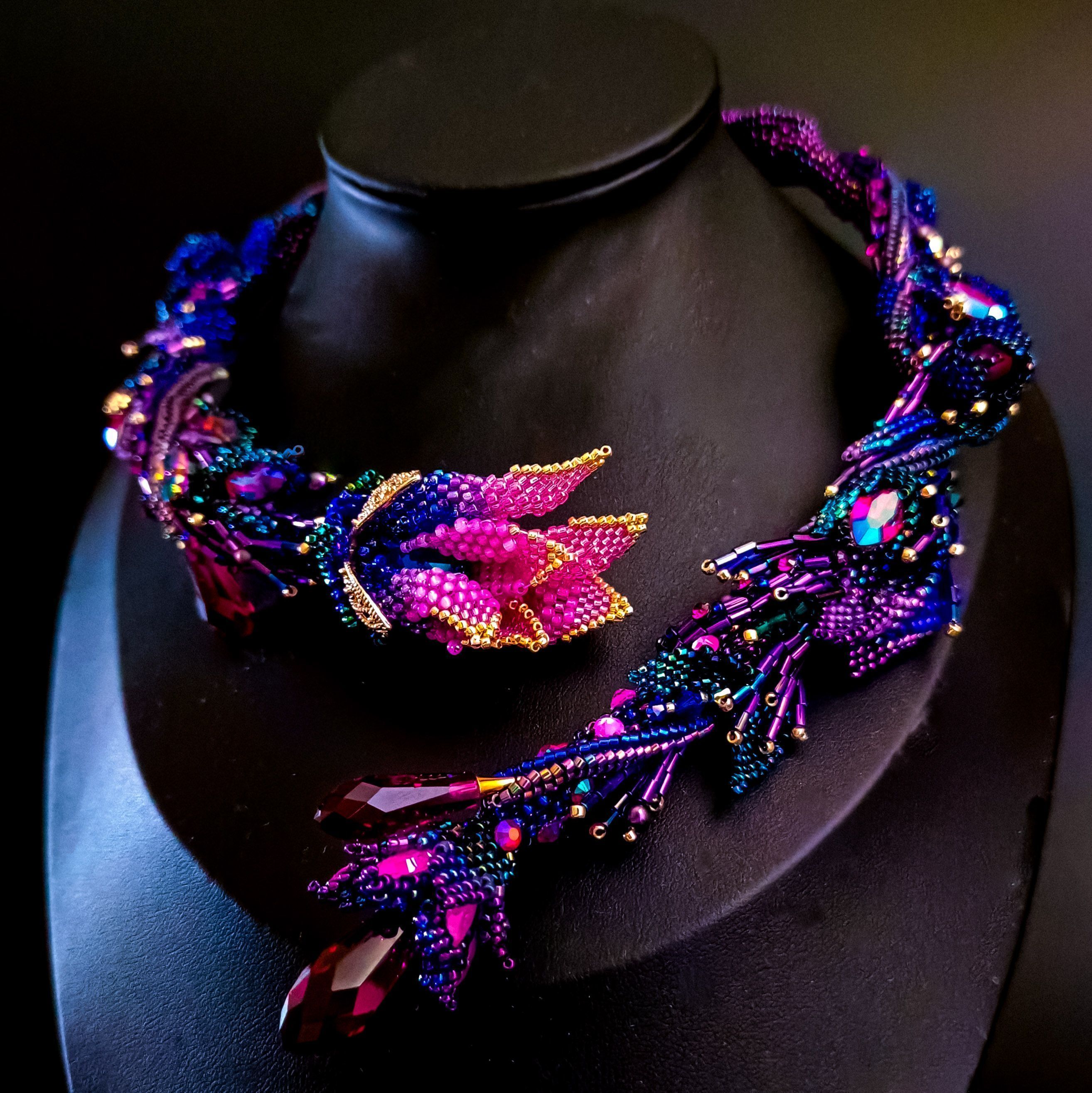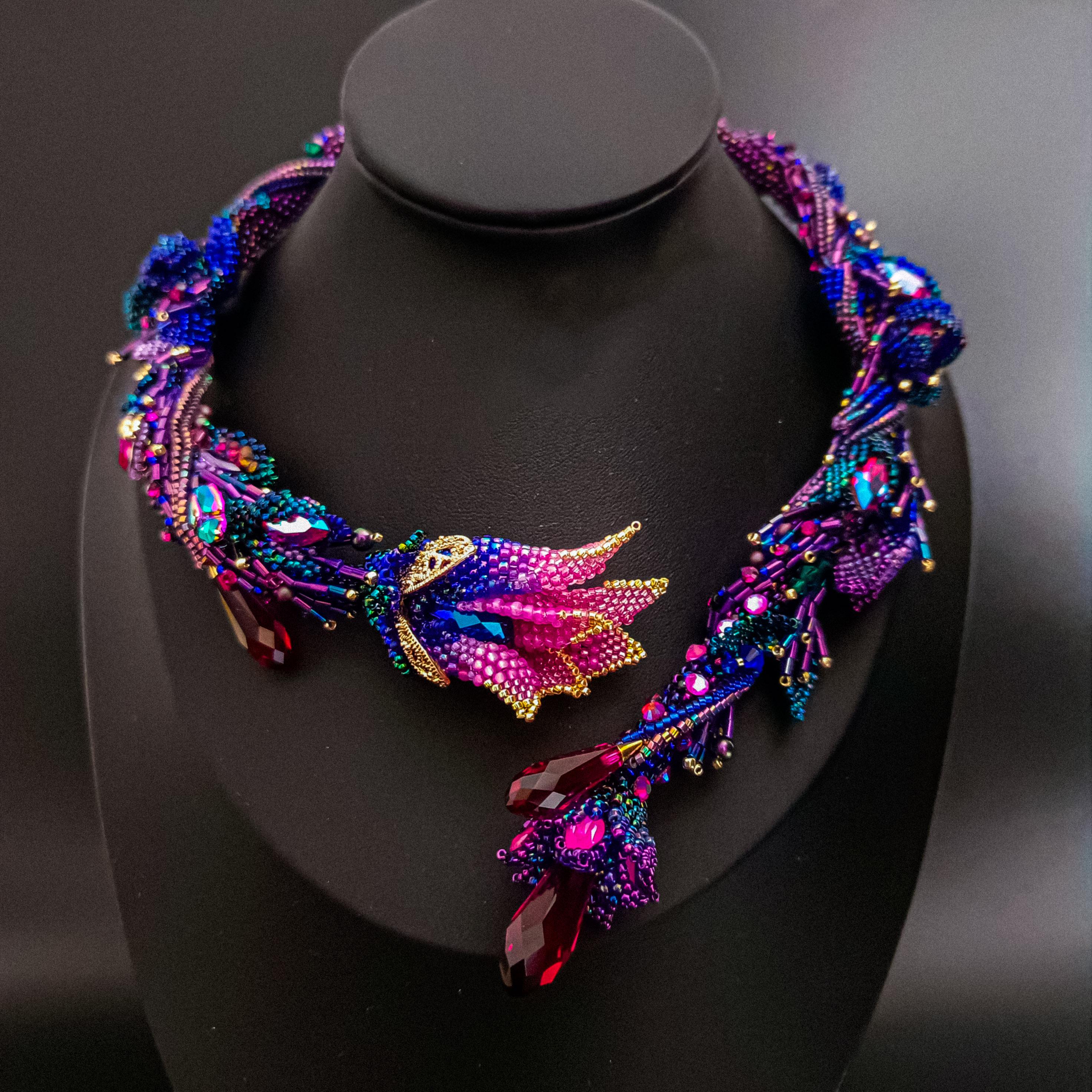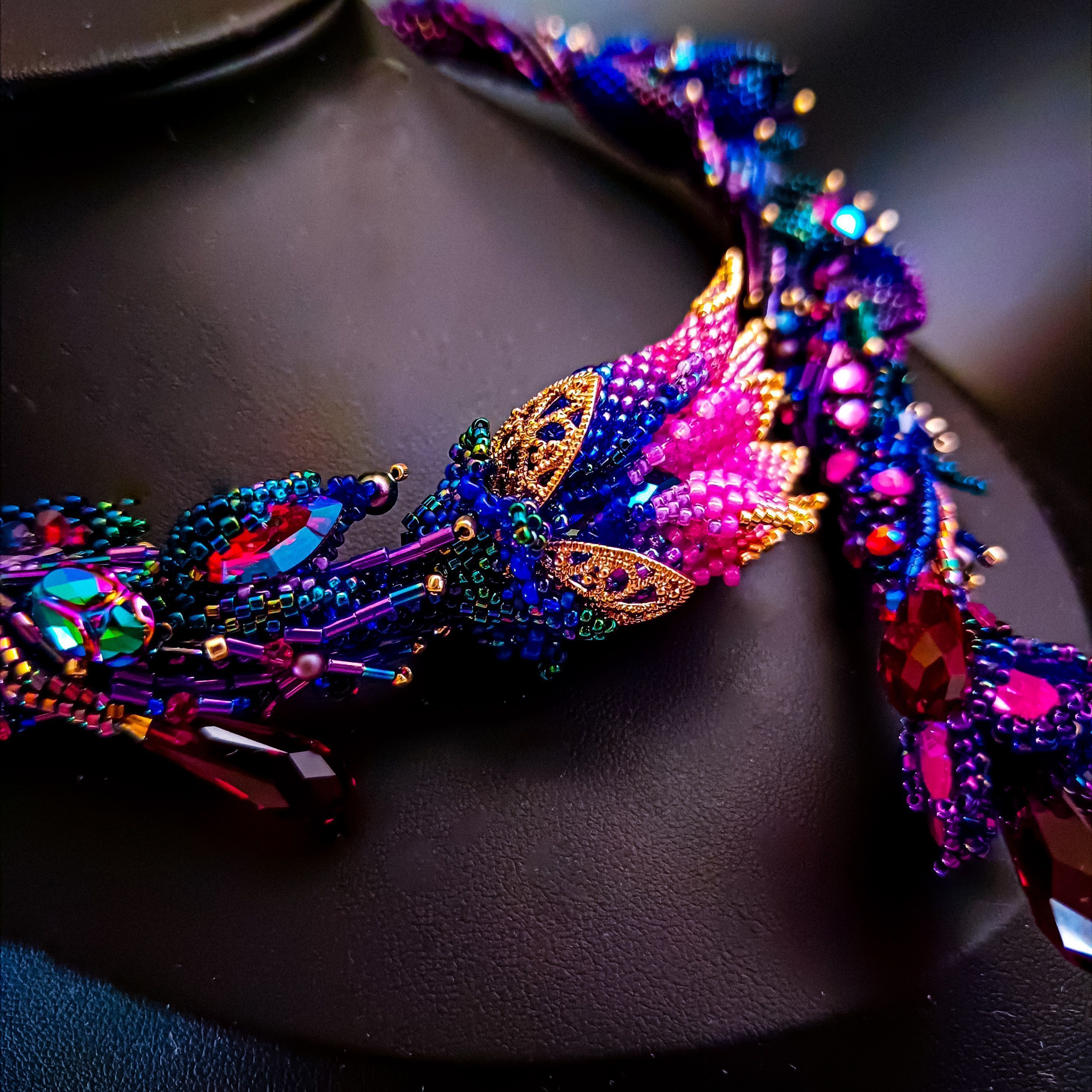 Однажды юная фея-ювелир, очарованная этим зрелищем, решила увековечить танец цветка. Она собрала капли лунного света, нити звездной пыли и росу с лепестков. Ночь за ночью фея плела удивительное ожерелье, вплетая в него грацию и магию танцующего цветка.