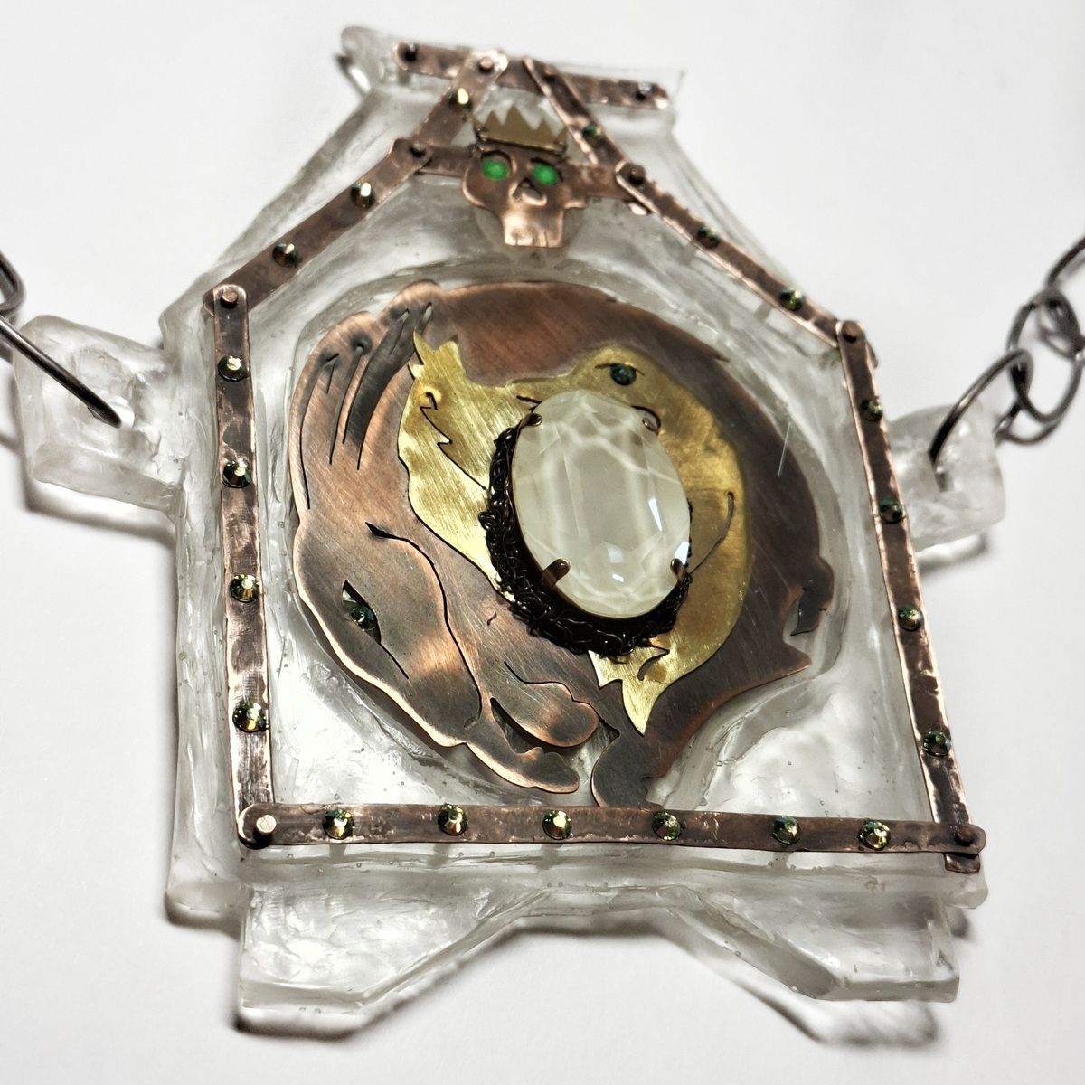 Колье Смерть Кощея выполнено из меди, латуни, эпоксидной смолы, декорировано кристаллами. Цепь сделана вручную из медной проволоки.
