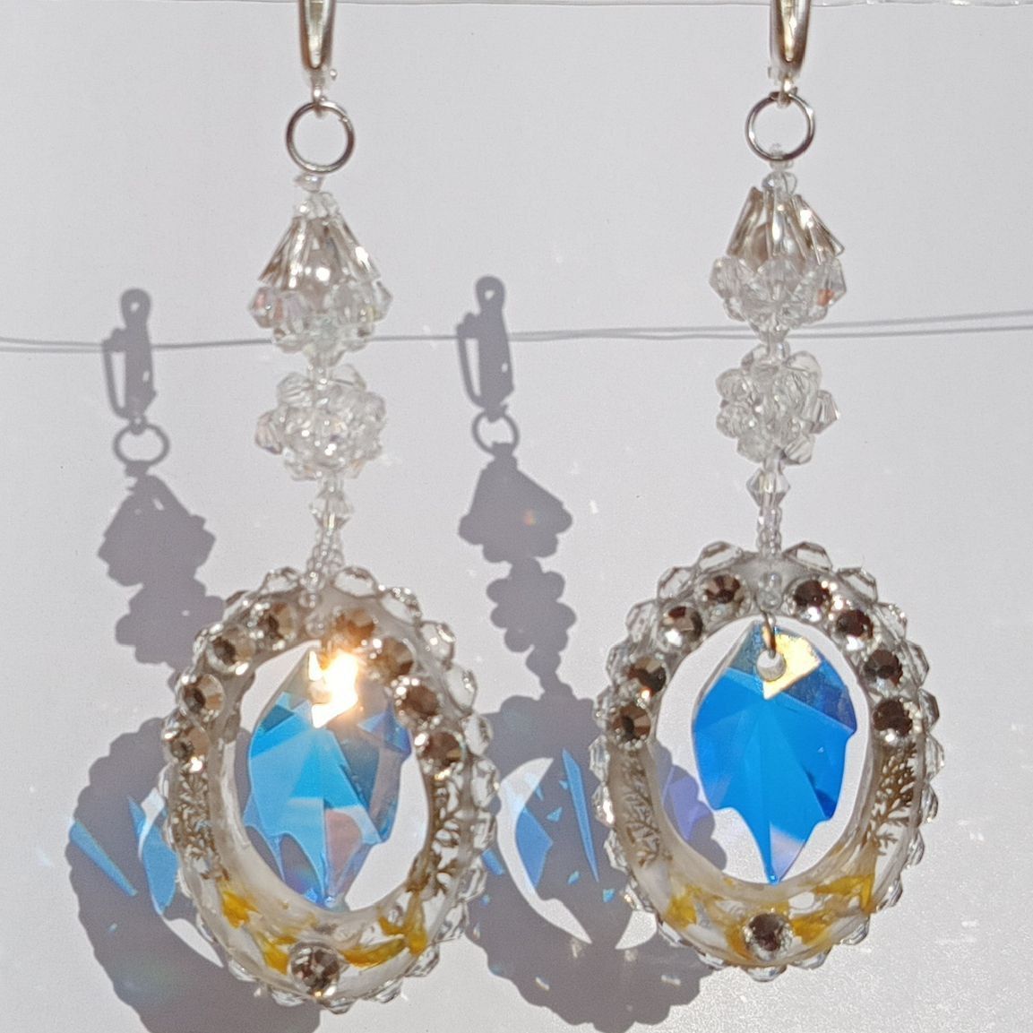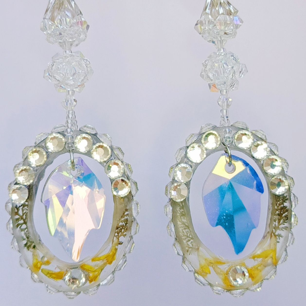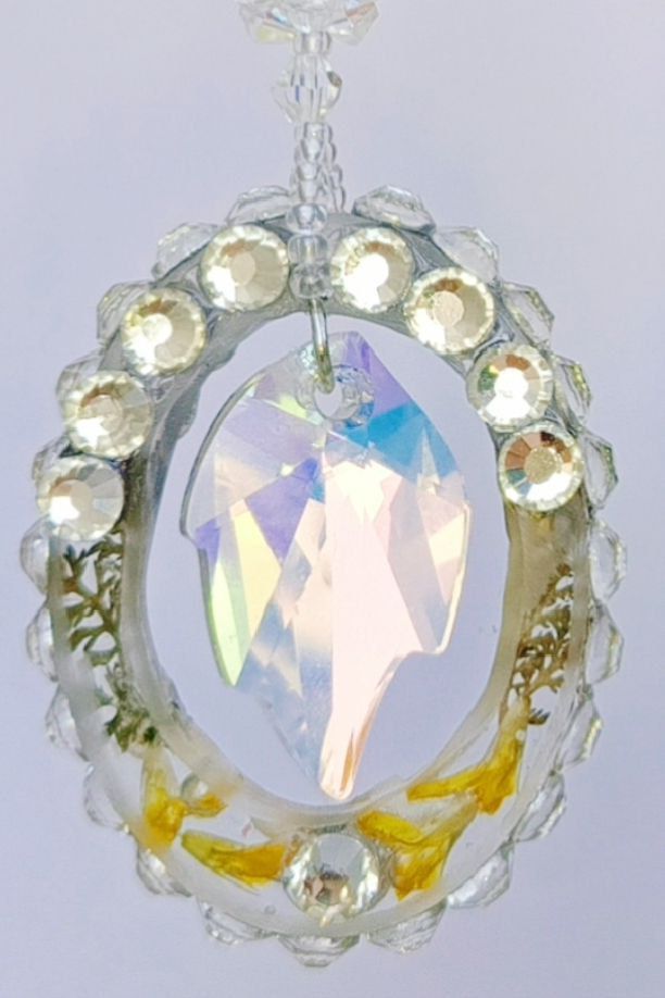 В моей работе использованы живые цветы в эпоксидной смоле, в форме овала внутри которого находится кристалл в форме листочка, также использованы  биконусы, бисер и клеевые стразы кристальных оттенков, а хрусталь, эпоксидная смола и конечно цветы относятся к тайным чудесам природы.