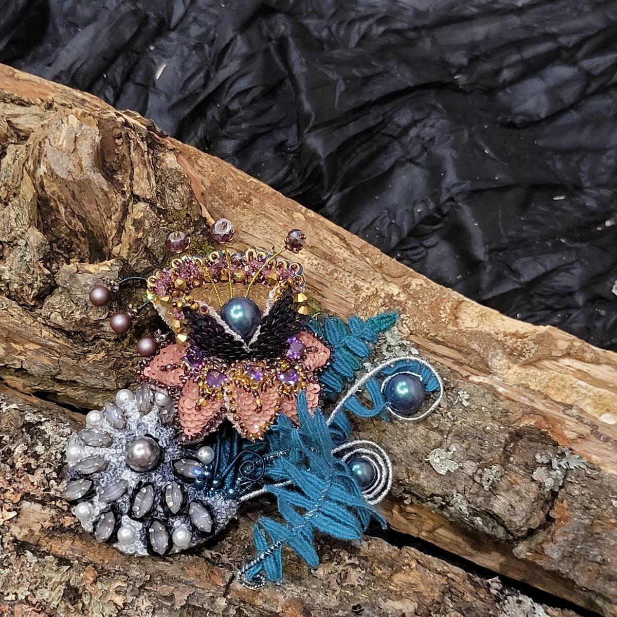 Брошь ярко и образно передает атмосферу тайн и чудес, скрывающихся в недрах дикой природы. Выбранная цветовая гамма - холодные зелёные, бирюзовые оттенки и приглушённый аметистовый - создаёт эффект погружения в параллельную реальность, где привычные формы и образы трансформируются, открывая свои потаённые грани.