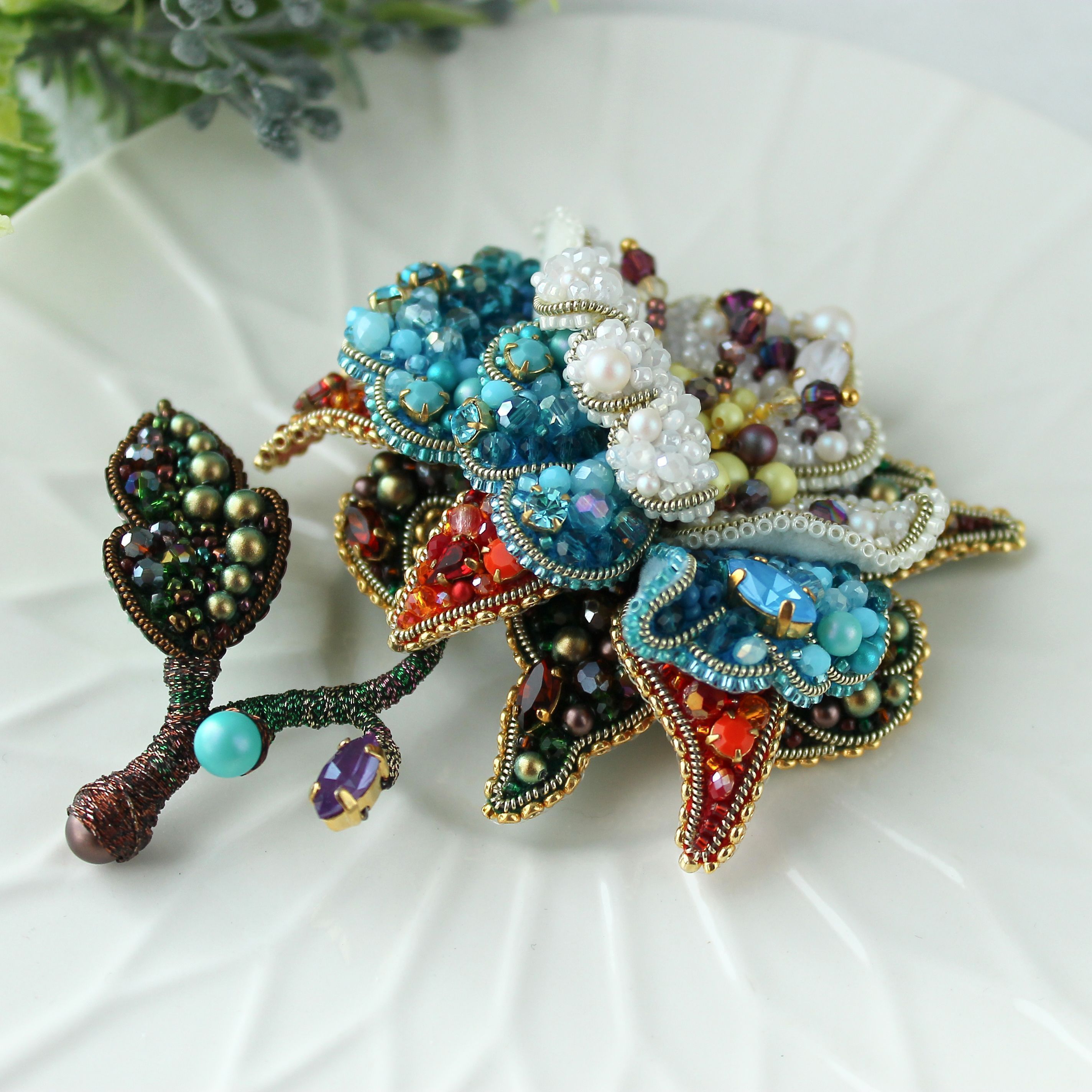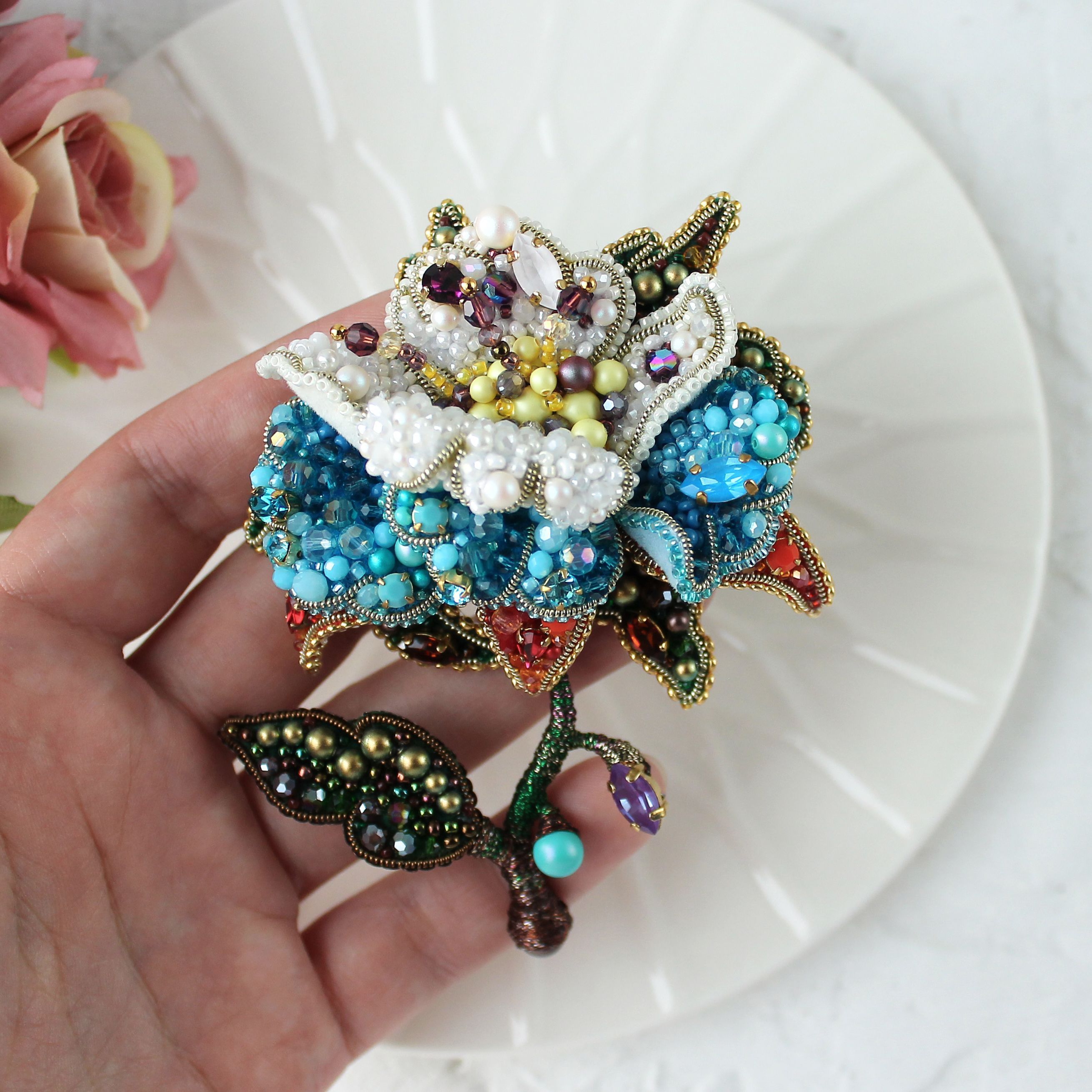 Ривенделл — сказочное и невероятно красивое убежище эльфов в фильме «Властелин Колец». Именно с этим местом у меня возникла первая ассоциация, когда я увидела тему работ. Этот волшебный объемный цветок выполнен в четырех цветовых гаммах: зелено/коричневой — что символизирует стихию земли, красно/оранжевой — стихия огня, сине/голубая — стихия воды и жемчужно/белой —  стихия воздуха. Он объединяет в себе всю их силу и способен наполнить ею того, кто к нему прикасается и стать верным талисманом!