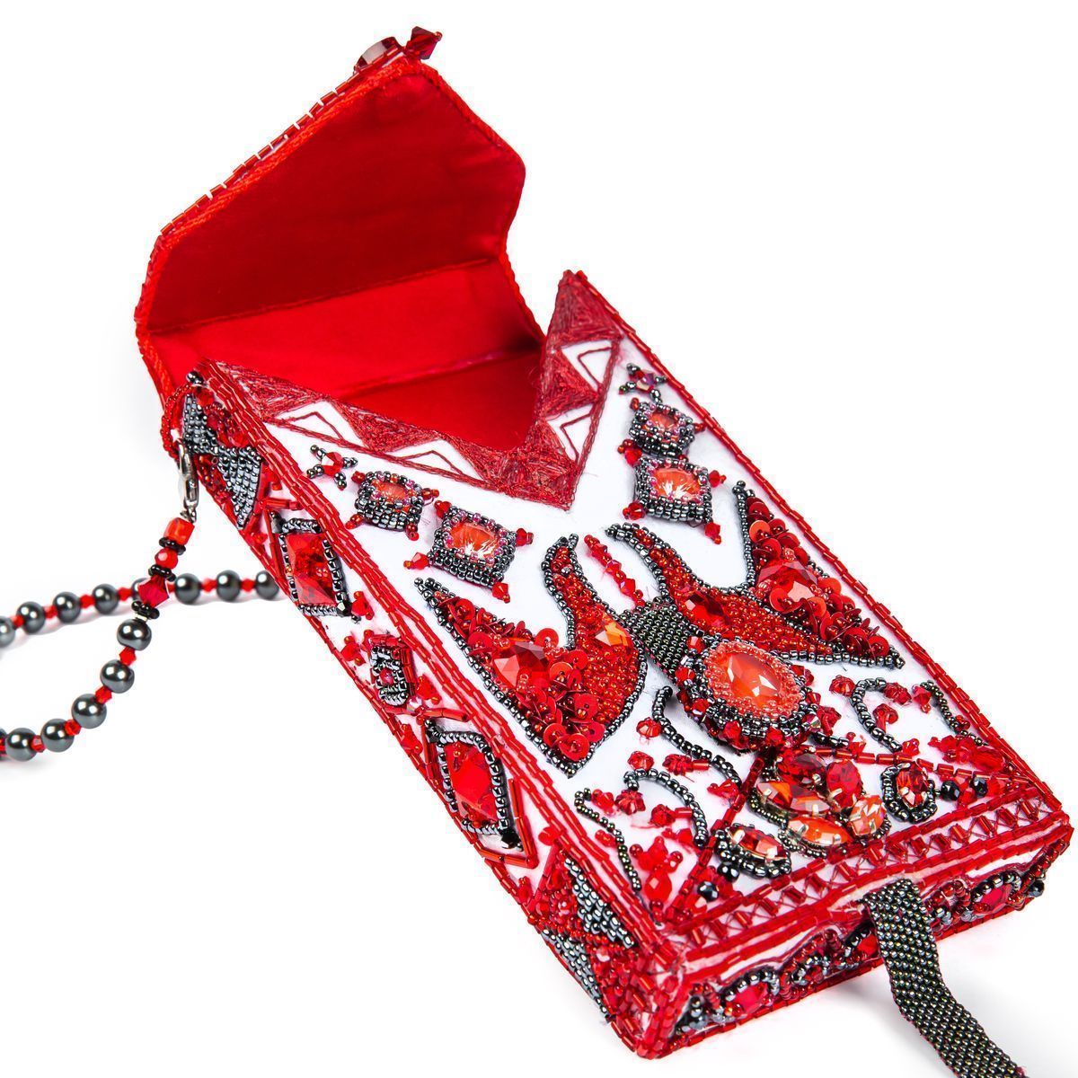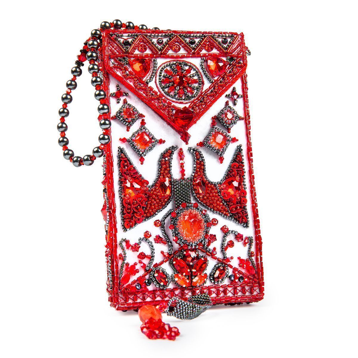 Таким вдохновляющим орнаментальным декором в стиле мезенской росписи я решила украсить небольшую сумочку для мобильного телефона. Для большей оригинальности основной кристалл подвижен на сплетённом из бисера узком пояске и таким образом на вашей руке образуется сверкающий перстень, а сумочка полностью помещается в ладони, при этом небольшую ручку можно убрать при помощи карабинов.
