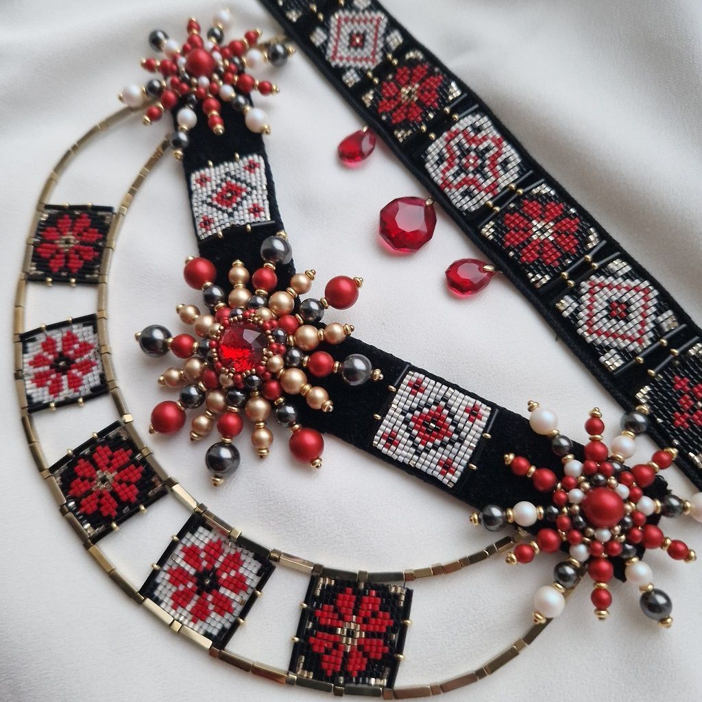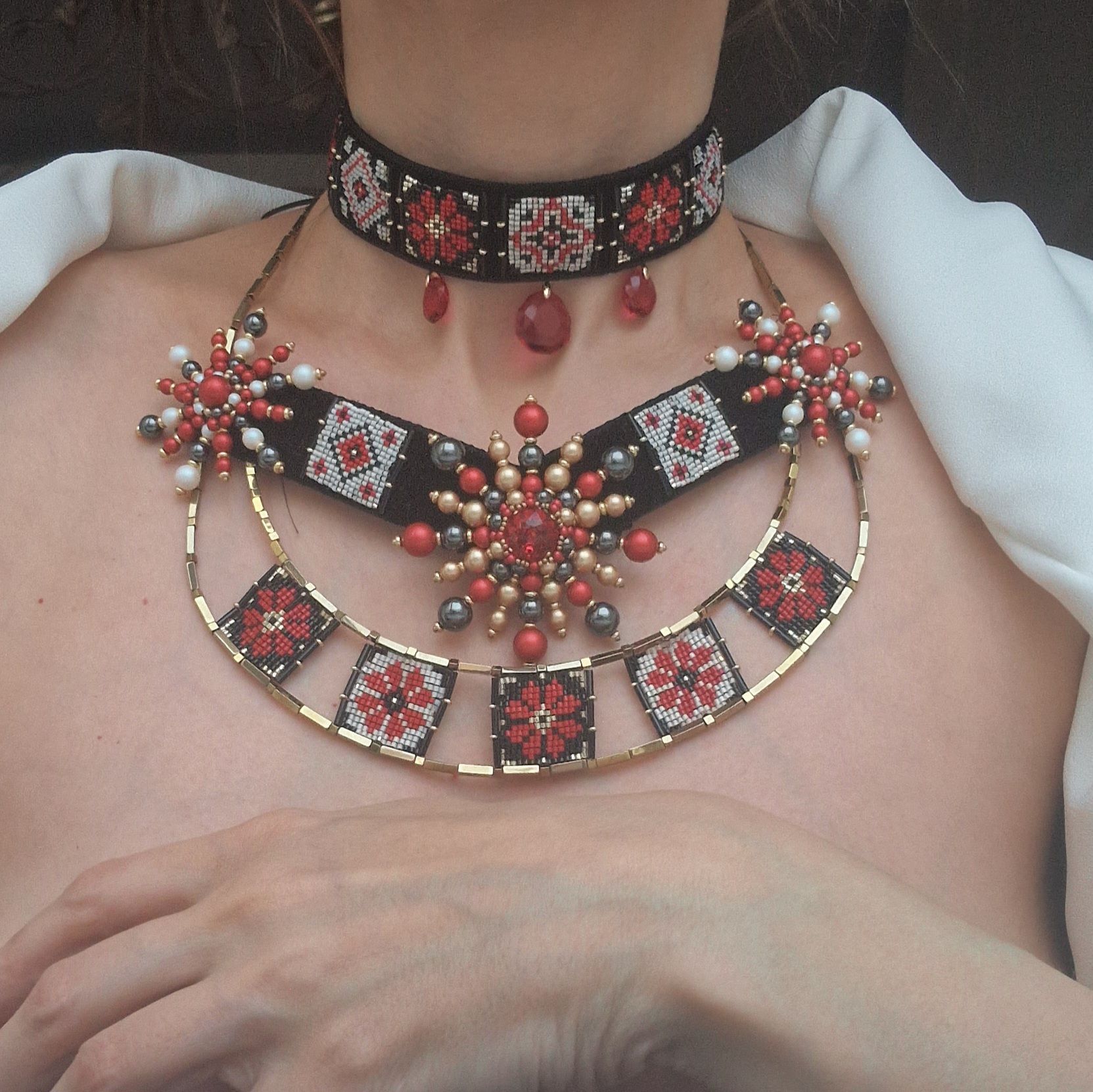 Тема конкурса - дань традициям в современном прочтении. Мне не хотелось сосредотачиваться на каком-то одном этнокультурном стиле. Поэтому я взяла за основу геометрические узоры, которые встречаются во многих культурах славян, и сделала колье, напоминающее по форме ожерелок.