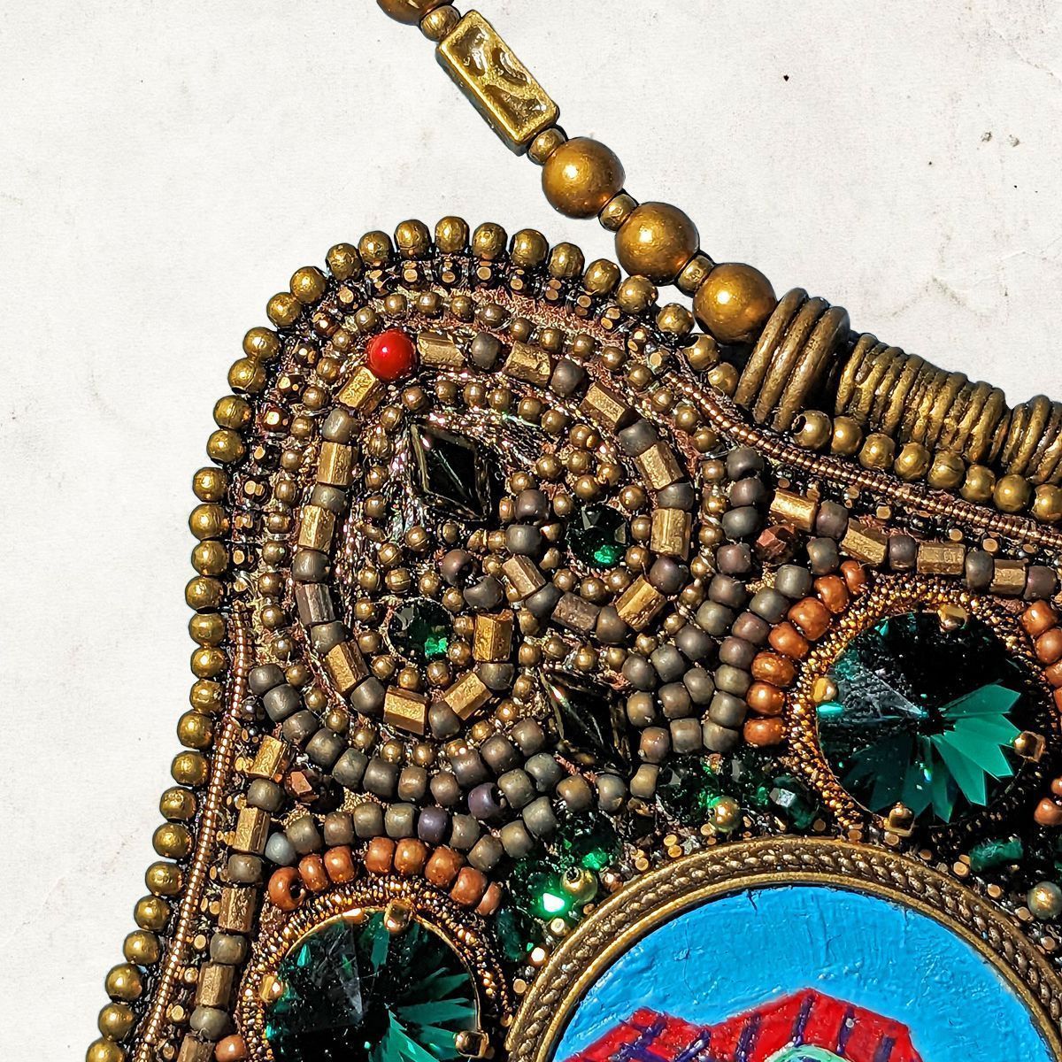 В каком бы уголке Земли мы ни жили, мы впитываем традиции этих мест. Именно поэтому свое колье я назвала "Город моего детства" (Тбилиси). Яркие резные балкончики, традиционные эмали "минанкари", резной орнамент, бронзовые скульптурки - все это легло в основу моей работы. А помогли мне в этом конкурсные кристаллы, обрамляющие авторскую миниатюру; бисер, который повторяет национальный резной орнамент; жемчуг, латунные элементы. И желание творить дальше.