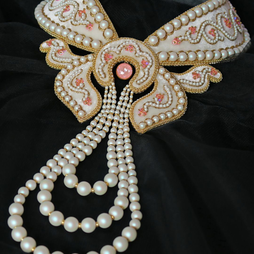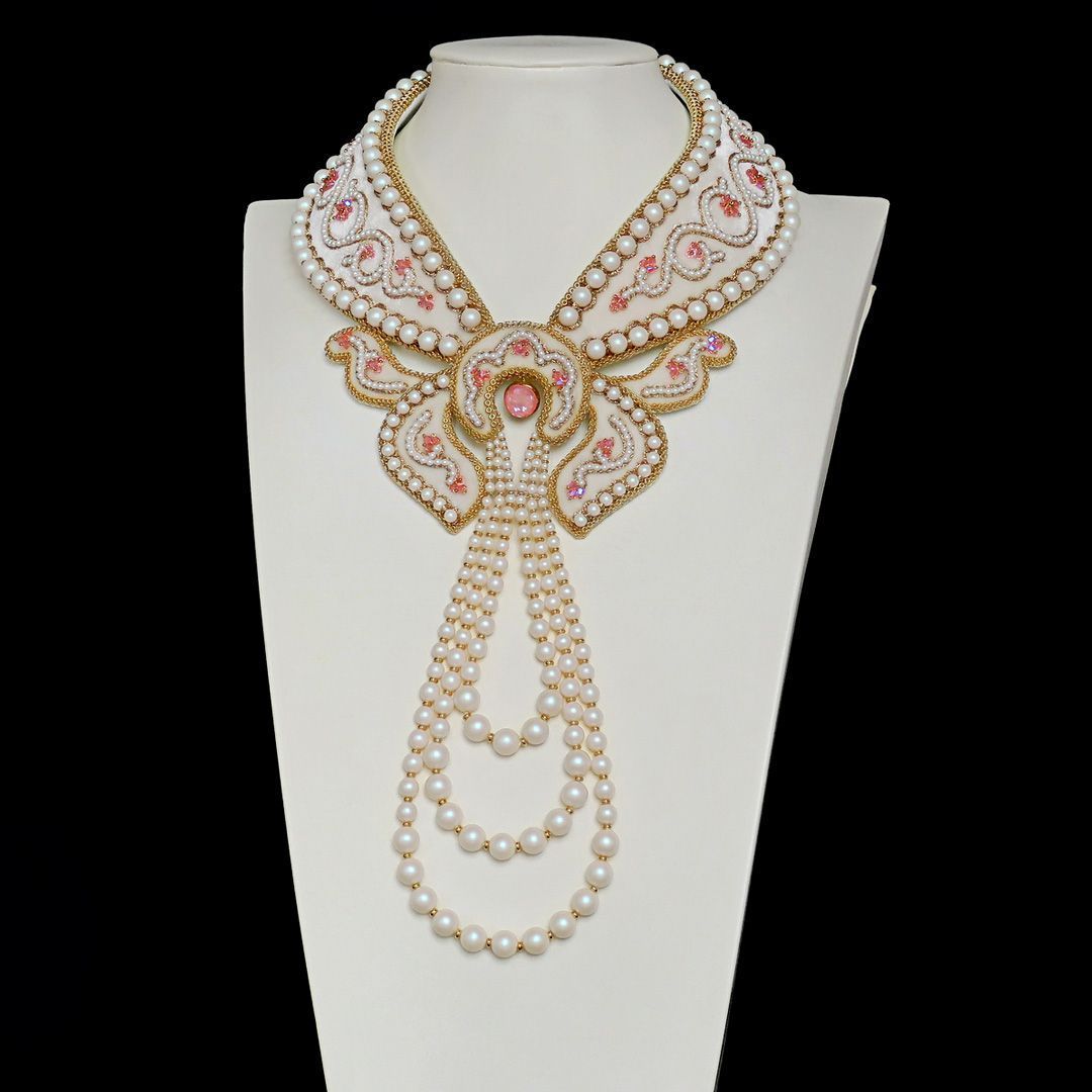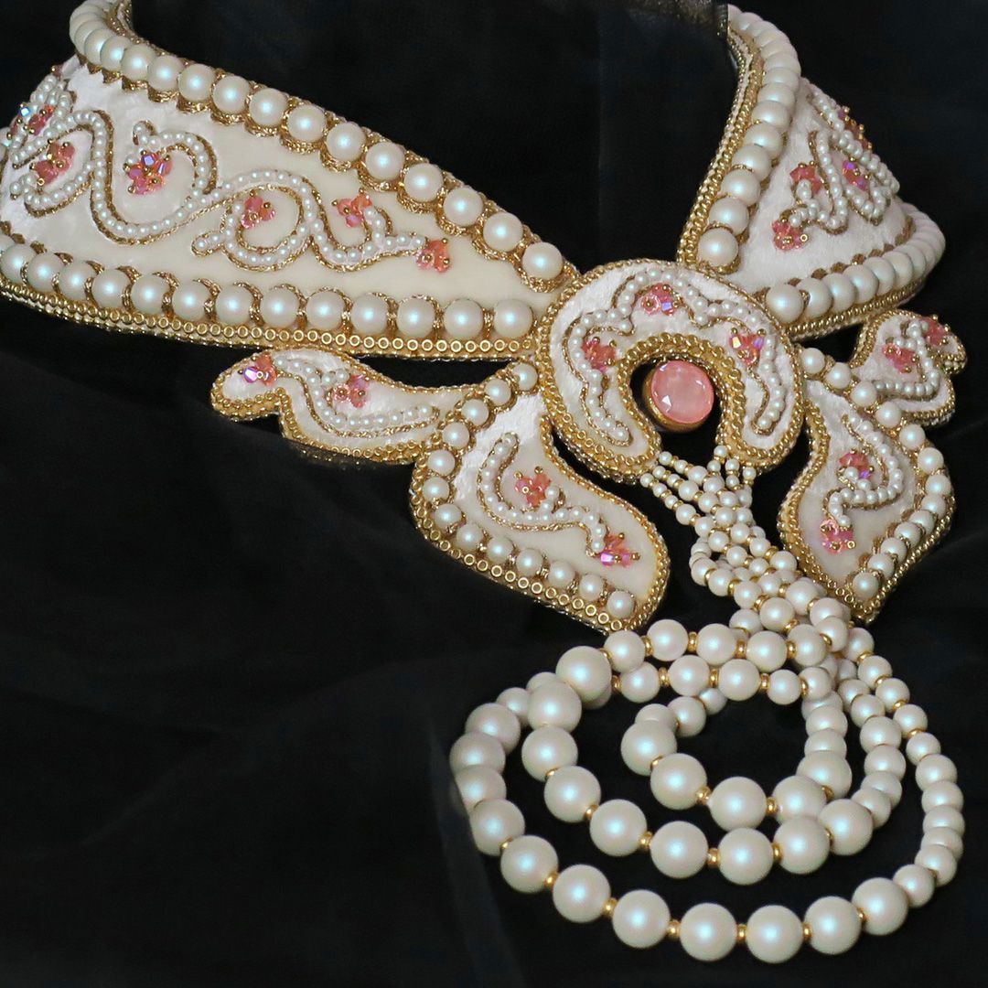 В своей работе я прибегла к технике жемчужного шитья (так называемое "сажение по бели"). Вышивка выполнена на шелковом бархате в классической цветовой гамме: белый жемчуг (в данном случае Pearlescent White) и золото. При этом Flamingo Ignite и Rose Peach Shimmer 2X отлично вписались в дизайн и придали колье свежести. По форме колье представляет собой полустойку с галстуком из жемчуга.