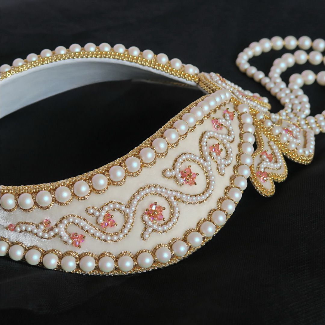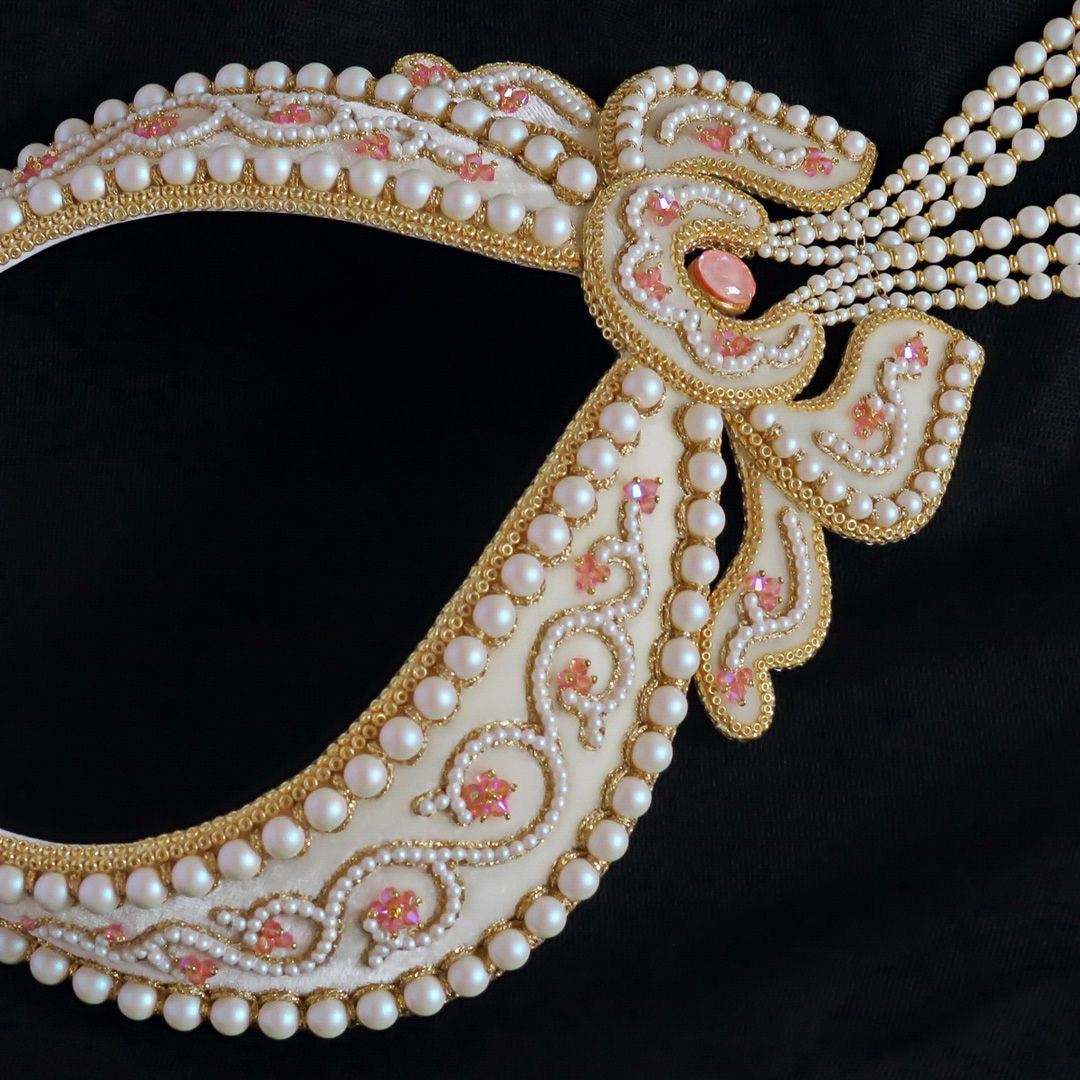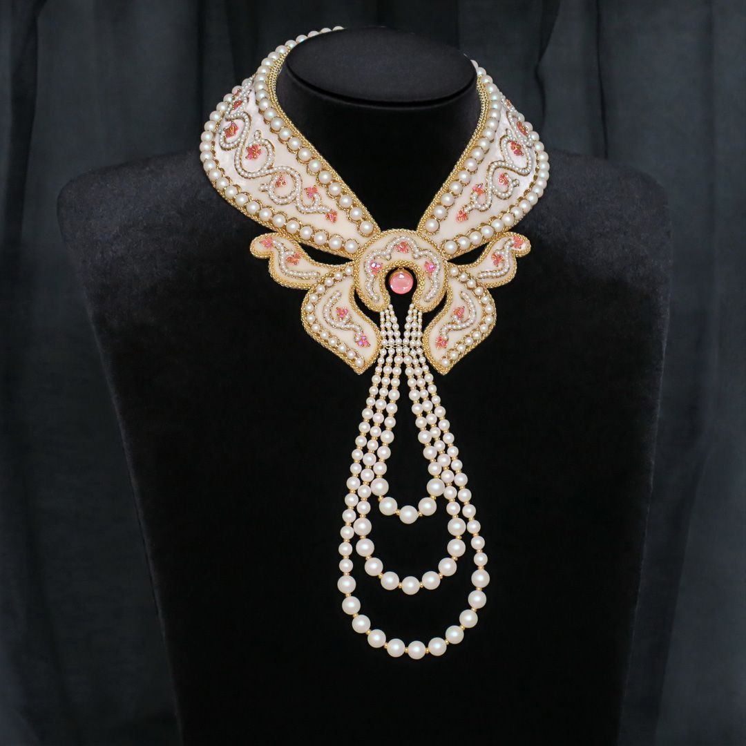 В своей работе я прибегла к технике жемчужного шитья (так называемое "сажение по бели"). Вышивка выполнена на шелковом бархате в классической цветовой гамме: белый жемчуг (в данном случае Pearlescent White) и золото. При этом Flamingo Ignite и Rose Peach Shimmer 2X отлично вписались в дизайн и придали колье свежести. По форме колье представляет собой полустойку с галстуком из жемчуга.