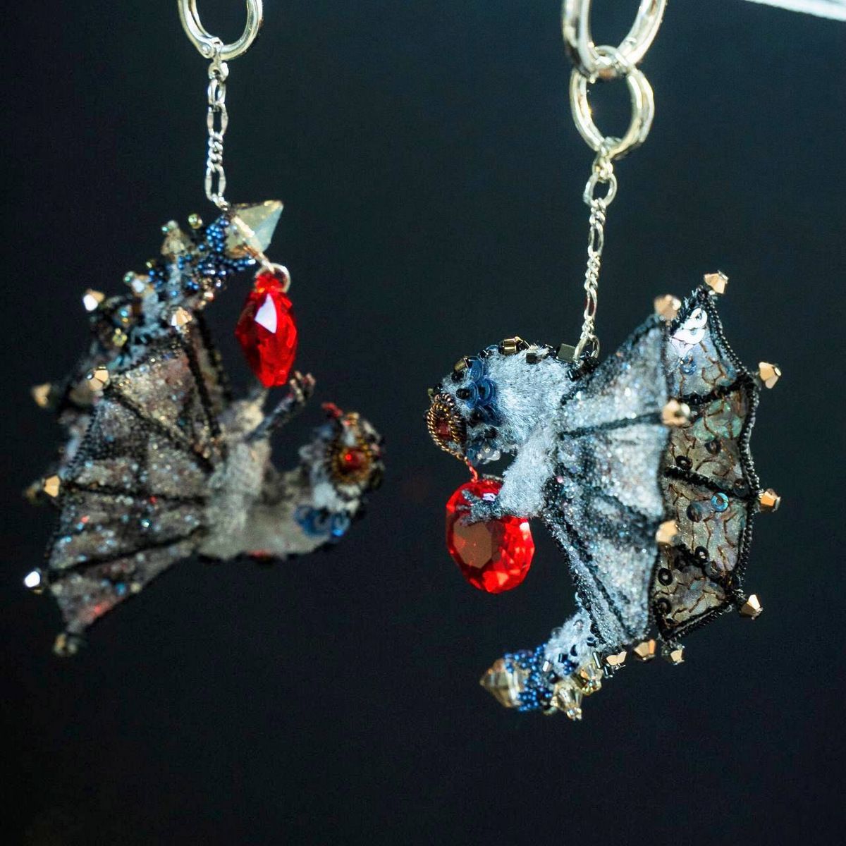 Драконы выполнены из бархата, на прочном каркасе.Расшиты бисером, кристаллами, пайетками и канителью. Крылья выполнены из органзы. С внутренней стороны расшиты пайетками и металлизированными нитями. С лицевой стороны украшены кристальной тканью Сваровски.