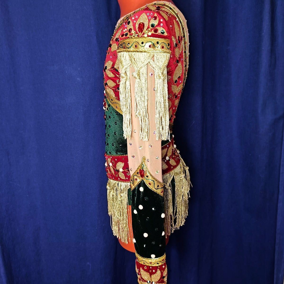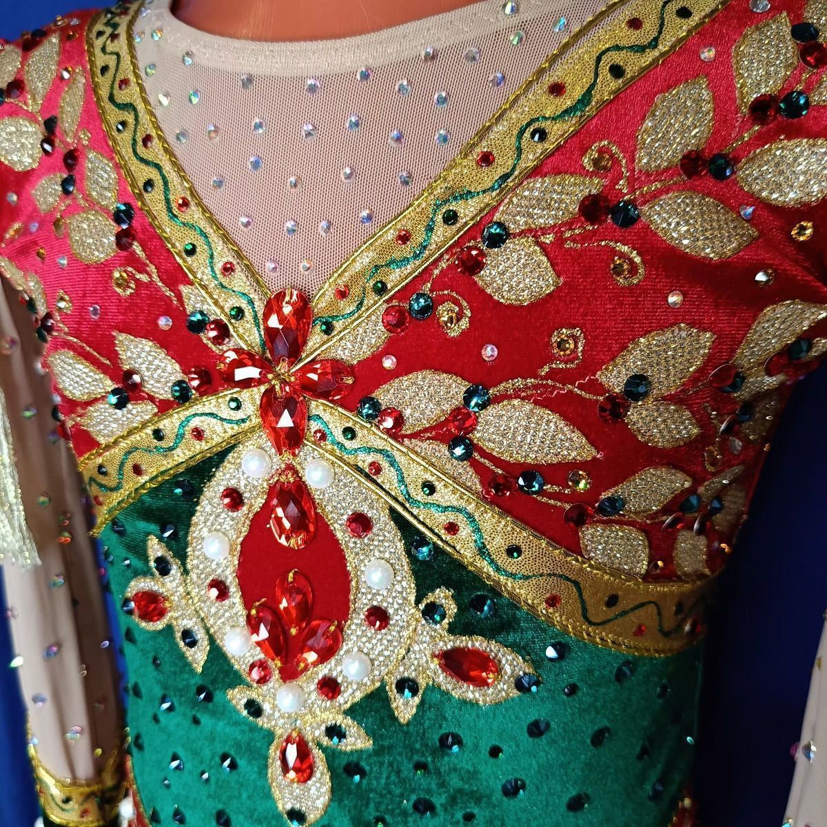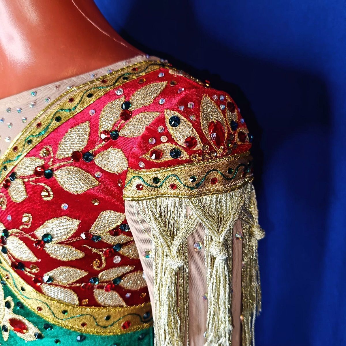 Тема традиций очевидно прослеживается в моей работе. Красно-зелено-золотая цветовая палитра и флористические элементы – яркие символы русского орнаментального стиля. Золотая бахрома, бархат, сияние камней и жемчуга придают образу имперский шик, отражающий роскошь царского убранства.