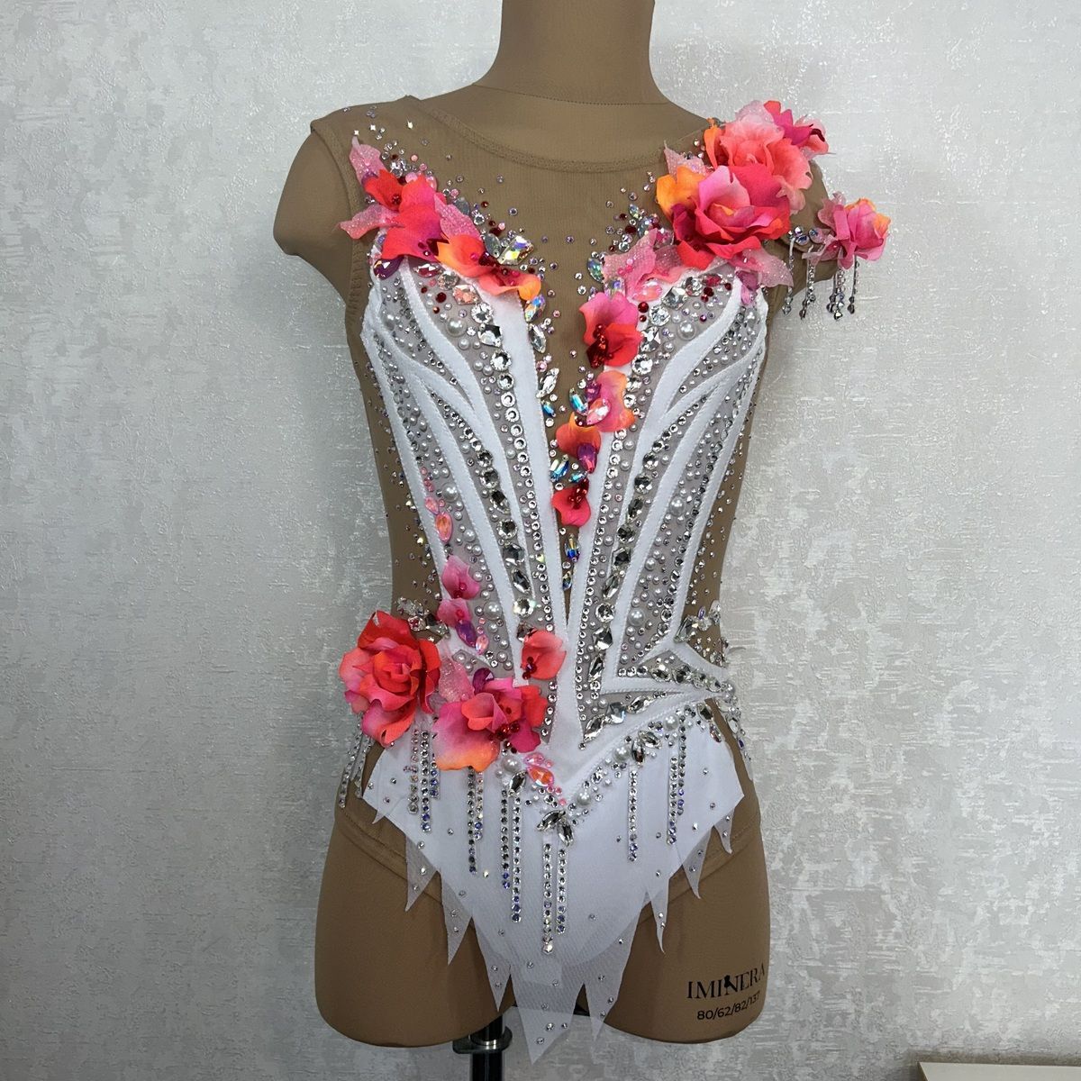 Акцентами композиции стали объёмные розово-алые розы, выполненные вручную в 3D-технике из сетки разных фактур. Каждый лепесток имеет уникальную форму, подкрашен и украшен стразами, создавая эффект живых цветов. Розы упругие, держат форму и не теряют её после стирки вместе с купальником.