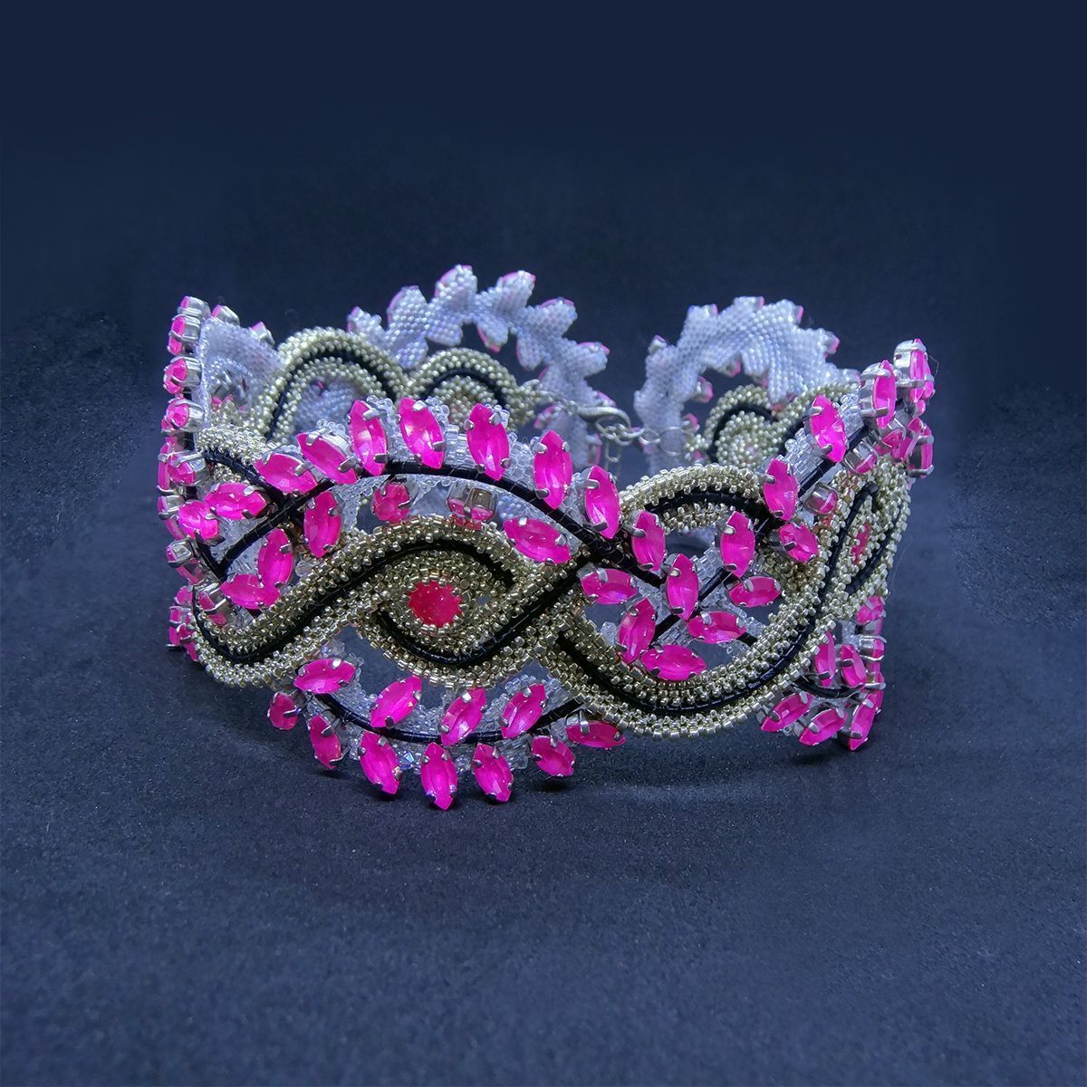 В данной работе я хотела обратиться к классическому дизайну, но решить его в ярком современном цвете. Основной тон задает растительный орнамент в тесном переплетении со строгими графическим формами. Такое украшение будет актуально в современном варианте Венского бала, а если там еще будут и ультрафиолетовые лампы, то колье заиграет неожиданными красками и в темноте.