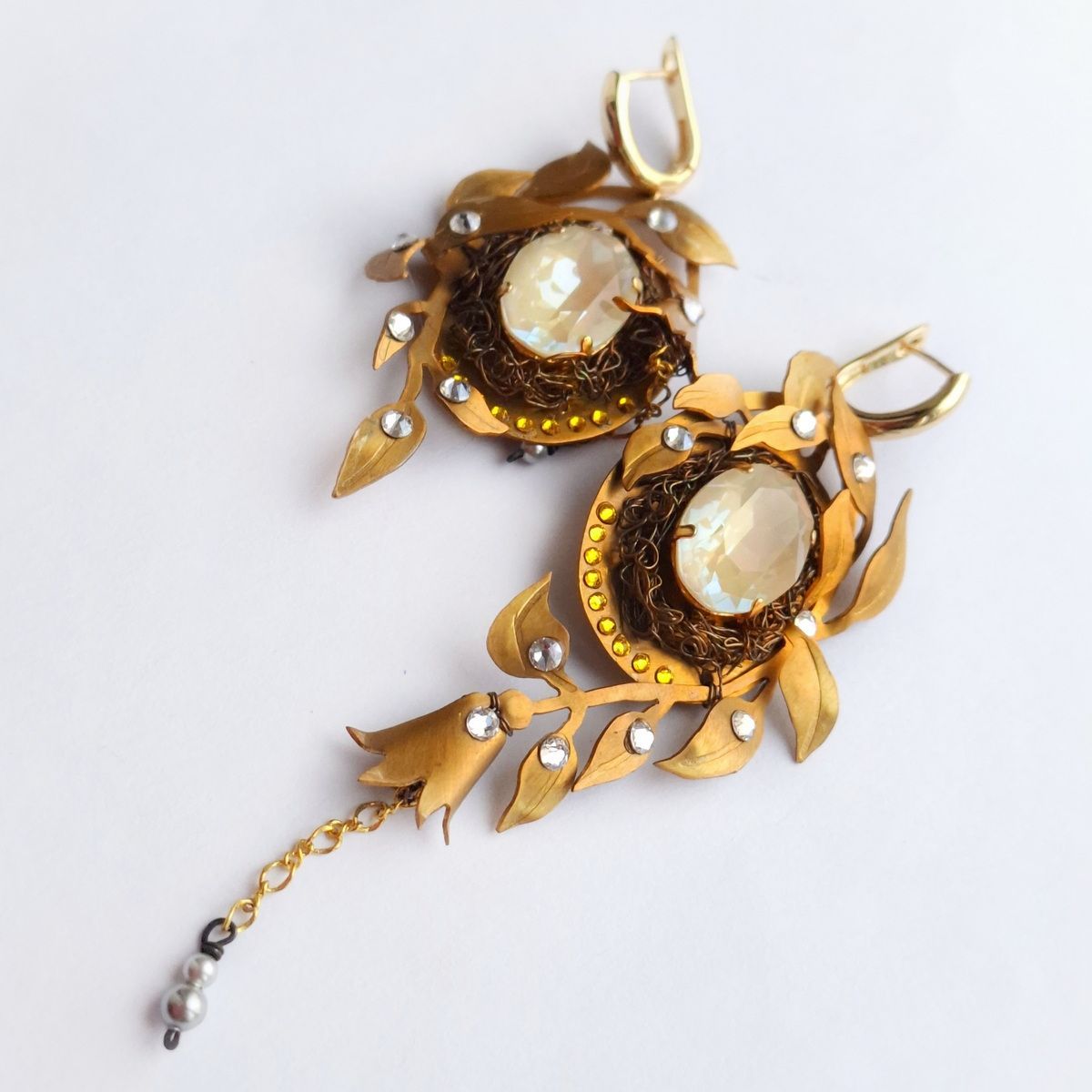 Серьги «Туман на заре» выполнены из латуни, декорированы кристаллами.